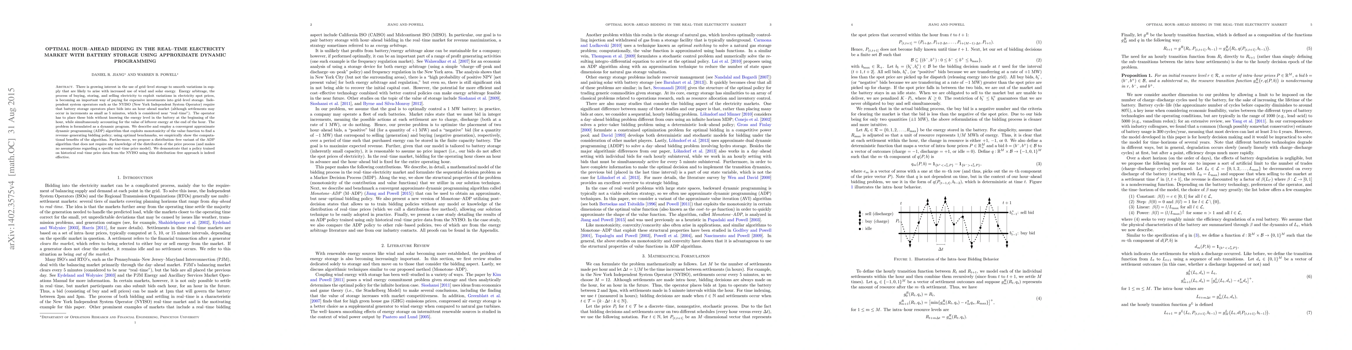 There is growing interest in the use of grid-level storage to smooth variations in supply that are likely to arise with increased use of wind and solar energy. Energy arbitrage, the process of buying, storing, and selling electricity to exploit variations in electricity spot prices, is becoming an important way of paying for expensive investments into grid-level storage. Independent system operators such as the NYISO (New York Independent System Operator) require that battery storage operators place bids into an hour-ahead market (although settlements may occur in increments as small as 5 minutes, which is considered near "real-time"). The operator has to place these bids without knowing the energy level in the battery at the beginning of the hour, while simultaneously accounting for the value of leftover energy at the end of the hour. The problem is formulated as a dynamic program. We describe and employ a convergent approximate dynamic programming (ADP) algorithm that exploits monotonicity of the value function to find a revenue-generating bidding policy; using optimal benchmarks, we empirically show the computational benefits of the algorithm. Furthermore, we propose a distribution-free variant of the ADP algorithm that does not require any knowledge of the distribution of the price process (and makes no assumptions regarding a specific real-time price model). We demonstrate that a policy trained on historical real-time price data from the NYISO using this distribution-free approach is indeed effective.