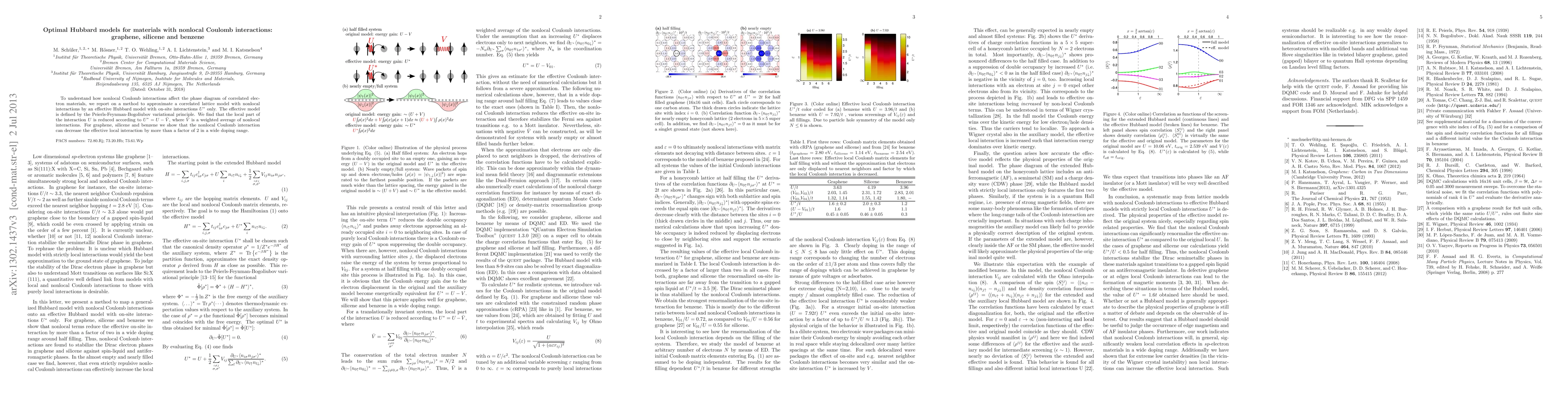 To understand how nonlocal Coulomb interactions affect the phase diagram of correlated electron materials, we report on a method to approximate a correlated lattice model with nonlocal interactions by an effective Hubbard model with on-site interactions U* only. The effective model is defined by the Peierls-Feynman-Bogoliubov variational principle. We find that the local part of the interaction U is reduced according to U*=U-V', where V' is a weighted average of nonlocal interactions. For graphene, silicene and benzene we show that the nonlocal Coulomb interaction can decrease the effective local interaction by more than a factor of 2 in a wide doping range.