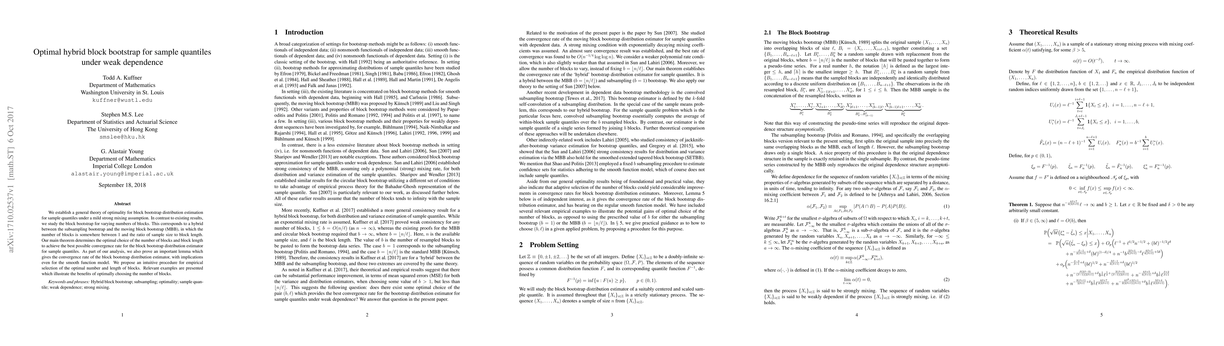 This paper develops an optimal hybrid block bootstrap method for estimating sample quantiles under weak dependence, determining the best number of blocks and block length for the best convergence rate. It also proposes a practical procedure for selecting these parameters and provides examples demonstrating the benefits of optimal choices.