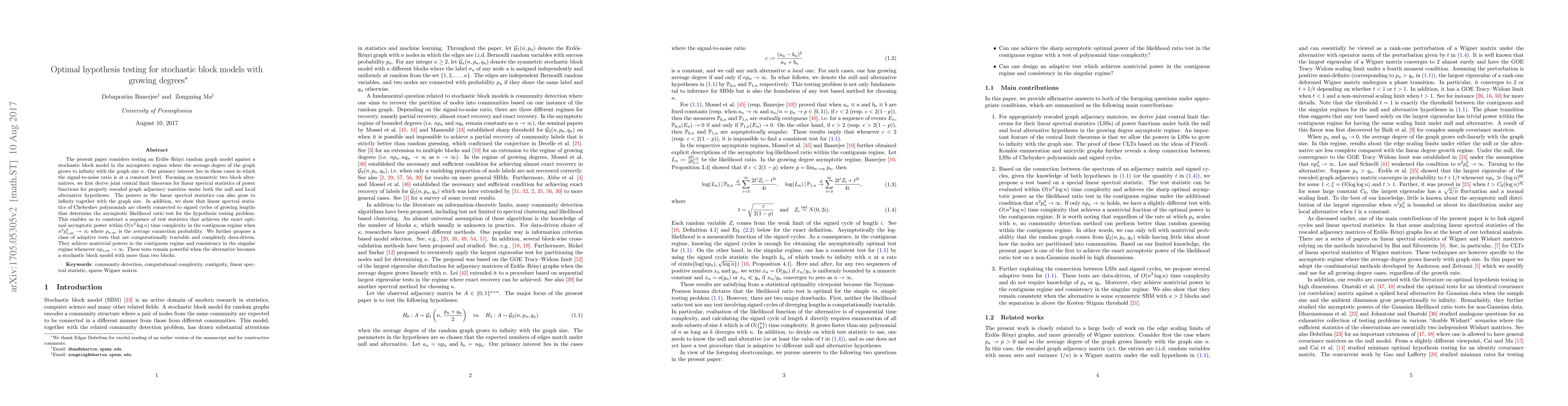The present paper considers testing an Erdos--Renyi random graph model against a stochastic block model in the asymptotic regime where the average degree of the graph grows with the graph size n. Our primary interest lies in those cases in which the signal-to-noise ratio is at a constant level. Focusing on symmetric two block alternatives, we first derive joint central limit theorems for linear spectral statistics of power functions for properly rescaled graph adjacency matrices under both the null and local alternative hypotheses. The powers in the linear spectral statistics are allowed to grow to infinity together with the graph size. In addition, we show that linear spectral statistics of Chebyshev polynomials are closely connected to signed cycles of growing lengths that determine the asymptotic likelihood ratio test for the hypothesis testing problem of interest. This enables us to construct a sequence of test statistics that achieves the exact optimal asymptotic power within $O(n^3 \log n)$ time complexity in the contiguous regime when $n^2 p_{n,av}^3 \to\infty$ where $p_{n,av}$ is the average connection probability. We further propose a class of adaptive tests that are computationally tractable and completely data-driven. They achieve nontrivial powers in the contiguous regime and consistency in the singular regime whenever $n p_{n,av} \to\infty$. These tests remain powerful when the alternative becomes a more general stochastic block model with more than two blocks.