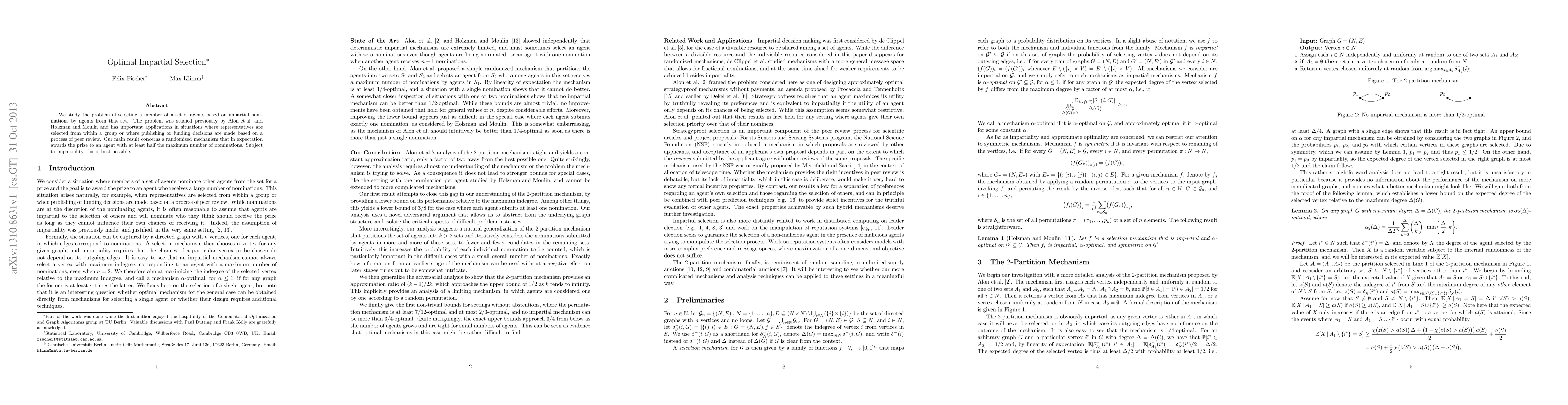 We study the problem of selecting a member of a set of agents based on impartial nominations by agents from that set. The problem was studied previously by Alon et al. and Holzman and Moulin and has important applications in situations where representatives are selected from within a group or where publishing or funding decisions are made based on a process of peer review. Our main result concerns a randomized mechanism that in expectation awards the prize to an agent with at least half the maximum number of nominations. Subject to impartiality, this is best possible.