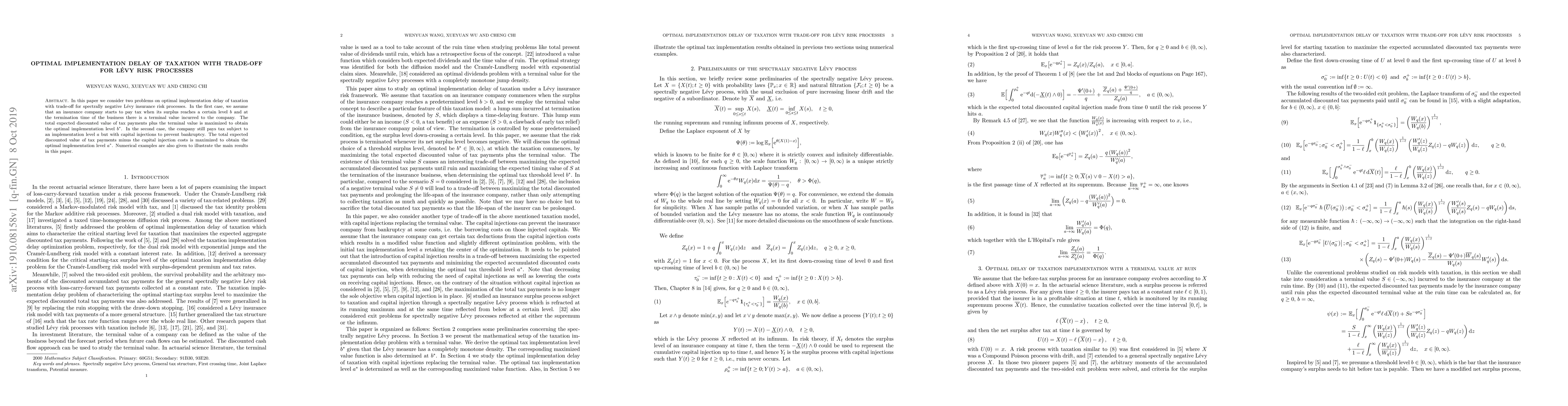 In this paper we consider two problems on optimal implementation delay of taxation with trade-off for spectrally negative L\'{e}vy insurance risk processes. In the first case, we assume that an insurance company starts to pay tax when its surplus reaches a certain level $b$ and at the termination time of the business there is a terminal value incurred to the company. The total expected discounted value of tax payments plus the terminal value is maximized to obtain the optimal implementation level $b^*$. In the second case, the company still pays tax subject to an implementation level $a$ but with capital injections to prevent bankruptcy. The total expected discounted value of tax payments minus the capital injection costs is maximized to obtain the optimal implementation level $a^*$. Numerical examples are also given to illustrate the main results in this paper.