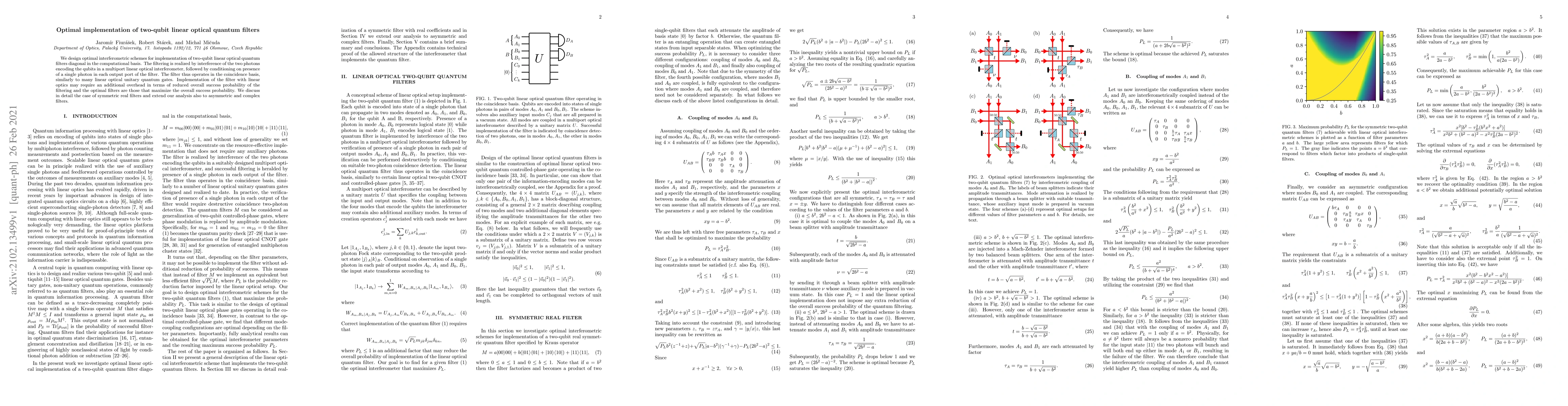 This paper designs optimal interferometric schemes for two-qubit linear optical quantum filters, maximizing success probability despite reduced overall efficiency. It focuses on symmetric real filters but also extends the analysis to asymmetric and complex filters.