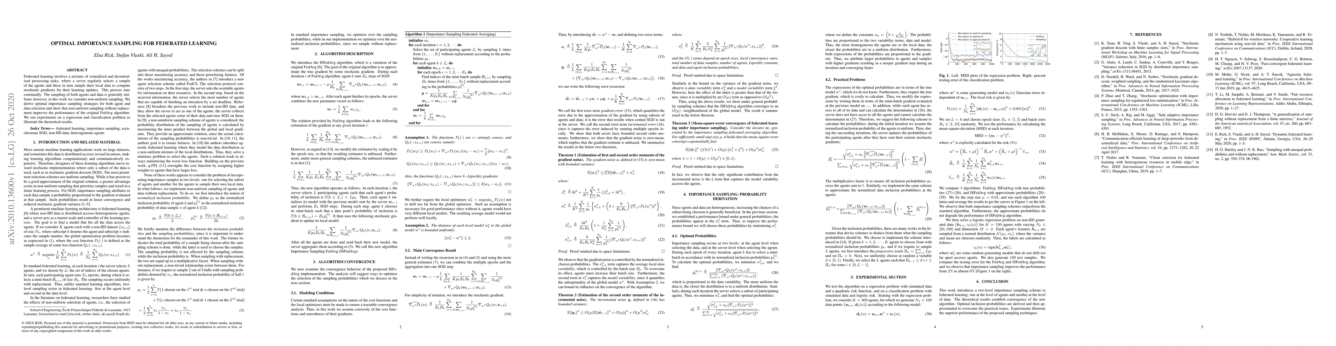 Federated learning involves a mixture of centralized and decentralized processing tasks, where a server regularly selects a sample of the agents and these in turn sample their local data to compute stochastic gradients for their learning updates. This process runs continually. The sampling of both agents and data is generally uniform; however, in this work we consider non-uniform sampling. We derive optimal importance sampling strategies for both agent and data selection and show that non-uniform sampling without replacement improves the performance of the original FedAvg algorithm. We run experiments on a regression and classification problem to illustrate the theoretical results.
