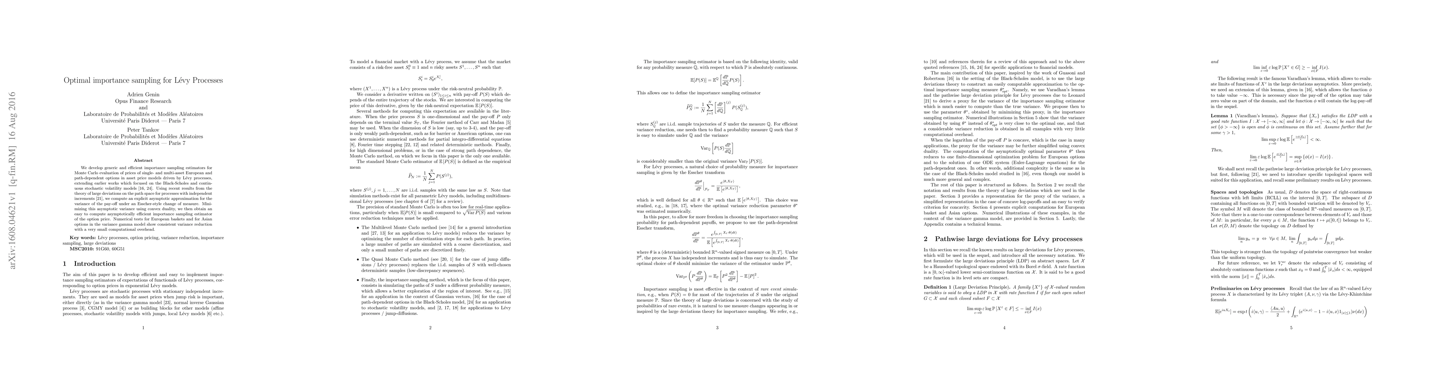 We develop generic and efficient importance sampling estimators for Monte Carlo evaluation of prices of single- and multi-asset European and path-dependent options in asset price models driven by L\'evy processes, extending earlier works which focused on the Black-Scholes and continuous stochastic volatility models. Using recent results from the theory of large deviations on the path space for processes with independent increments, we compute an explicit asymptotic approximation for the variance of the pay-off under an Esscher-style change of measure. Minimizing this asymptotic variance using convex duality, we then obtain an easy to compite asymptotically efficient importance sampling estimator of the option price. Numerical tests for European baskets and for Asian options in the variance gamma model show consistent variance reduction with a very small computational overhead.