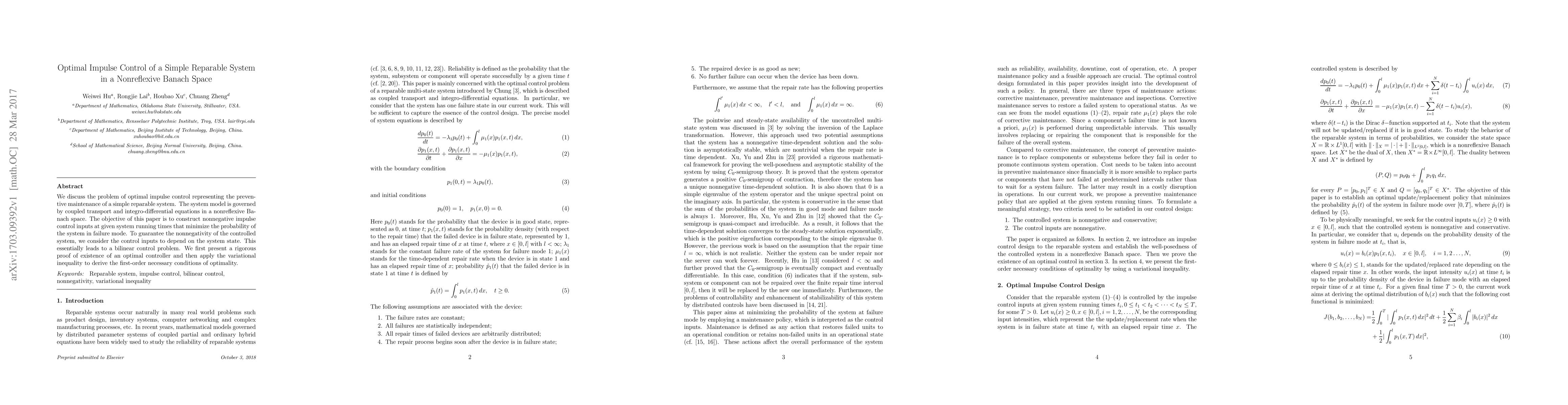 The paper investigates optimal impulse control of a reparable system in a nonreflexive Banach space to minimize the probability of failure. It presents a rigorous proof of existence and derives first-order necessary conditions for optimality using variational inequalities.