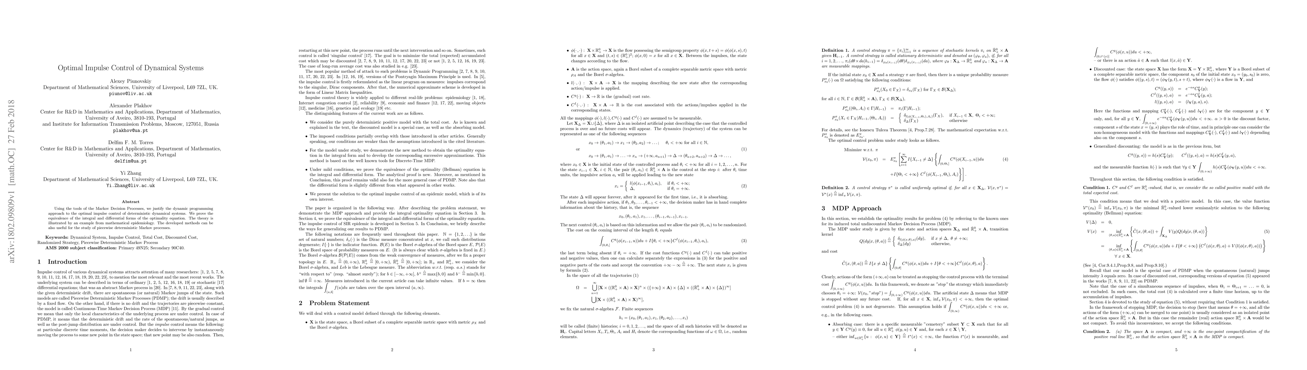 Using the tools of the Markov Decision Processes, we justify the dynamic programming approach to the optimal impulse control of deterministic dynamical systems. We prove the equivalence of the integral and differential forms of the optimality equation. The theory is illustrated by an example from mathematical epidemiology. The developed methods can be also useful for the study of piecewise deterministic Markov processes.