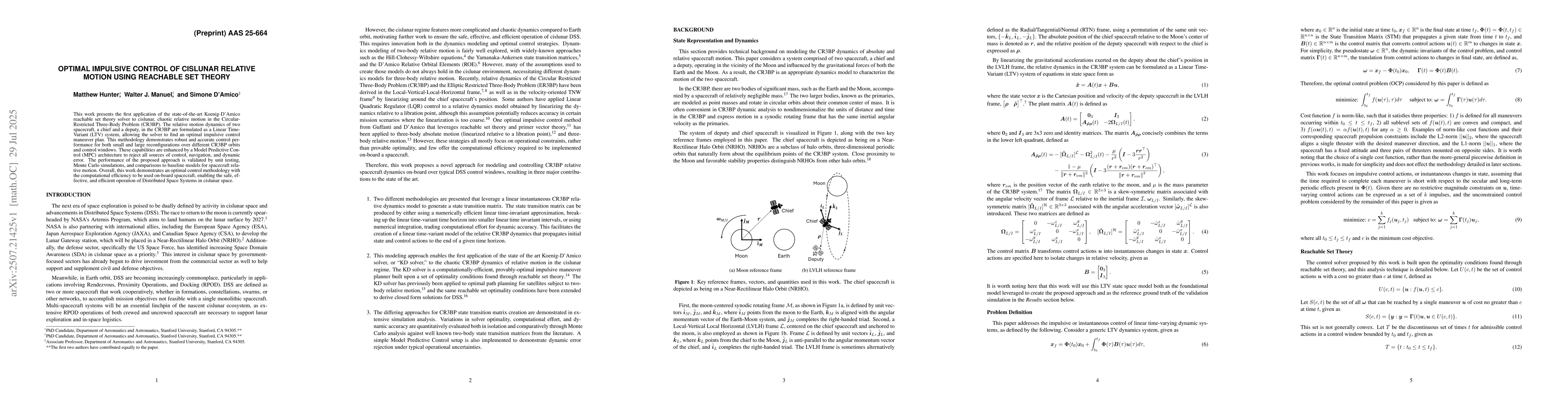 This research applies reachable set theory optimal control to Linear Time-Variant (LTV) dynamics systems for cislunar relative spacecraft motion, using a linear CR3BP model and numerical integration to produce State Transition Matrices (STMs) for impulsive control maneuvers.
