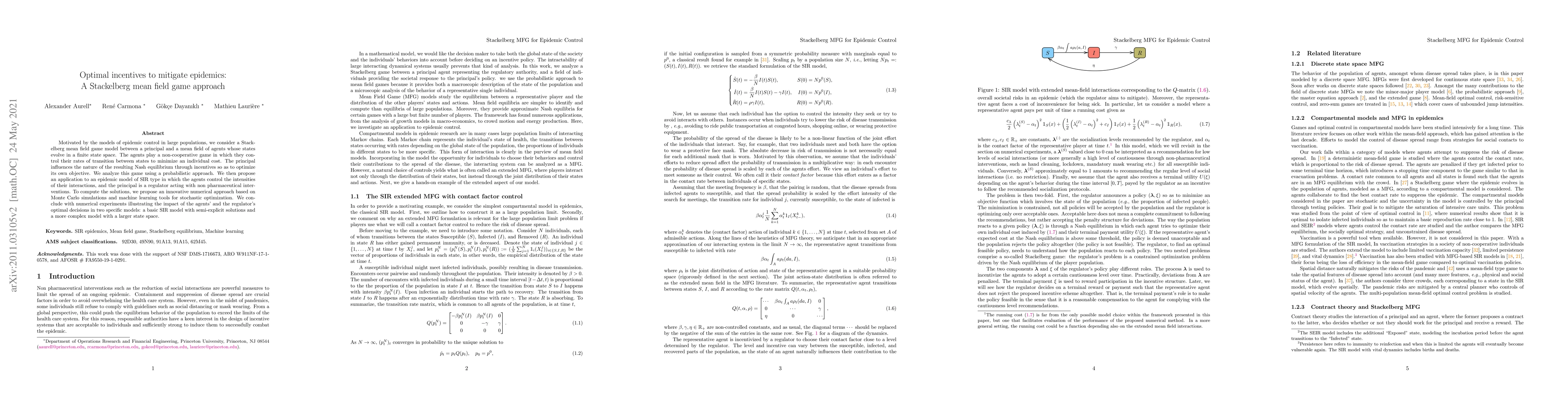 This paper develops a Stackelberg mean field game model to optimize epidemic control in large populations, where agents minimize individual costs by controlling transition rates. The principal influences the Nash equilibrium through incentives, and a novel numerical approach combining Monte Carlo simulations and machine learning optimizes solutions, demonstrated through SIR model applications.