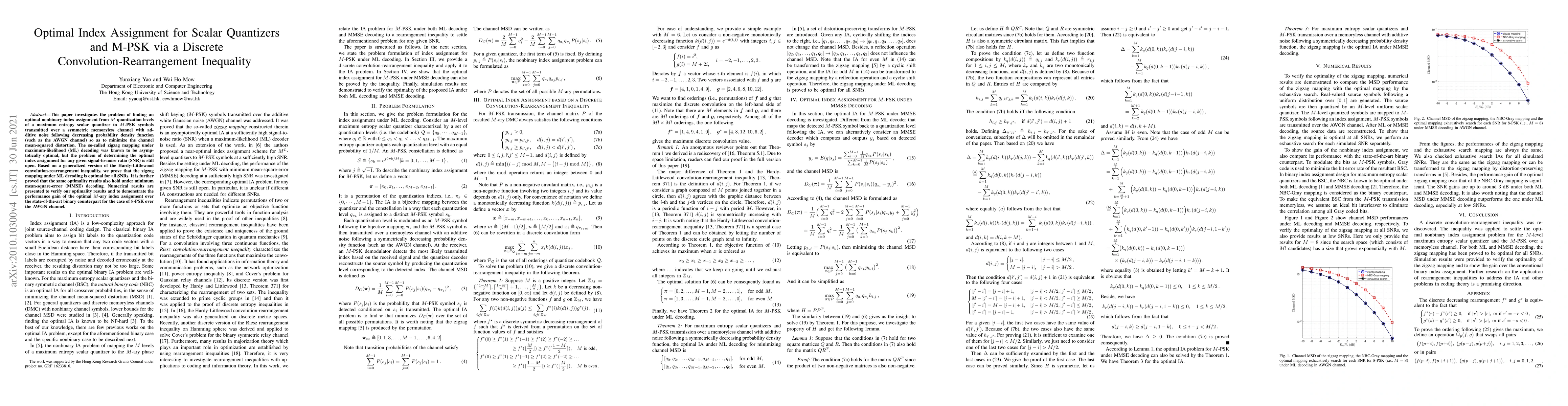 This paper investigates the problem of finding an optimal nonbinary index assignment from (M) quantization levels of a maximum entropy scalar quantizer to (M)-PSK symbols transmitted over a symmetric memoryless channel with additive noise following decreasing probability density function (such as the AWGN channel) so as to minimize the channel mean-squared distortion. The so-called zigzag mapping under maximum-likelihood (ML) decoding was known to be asymptotically optimal, but the problem of determining the optimal index assignment for any given signal-to-noise ratio (SNR) is still open. Based on a generalized version of the Hardy-Littlewood convolution-rearrangement inequality, we prove that the zigzag mapping under ML decoding is optimal for all SNRs. It is further proved that the same optimality results also hold under minimum mean-square-error (MMSE) decoding. Numerical results are presented to verify our optimality results and to demonstrate the performance gain of the optimal (M)-ary index assignment over the state-of-the-art binary counterpart for the case of (8)-PSK over the AWGN channel.