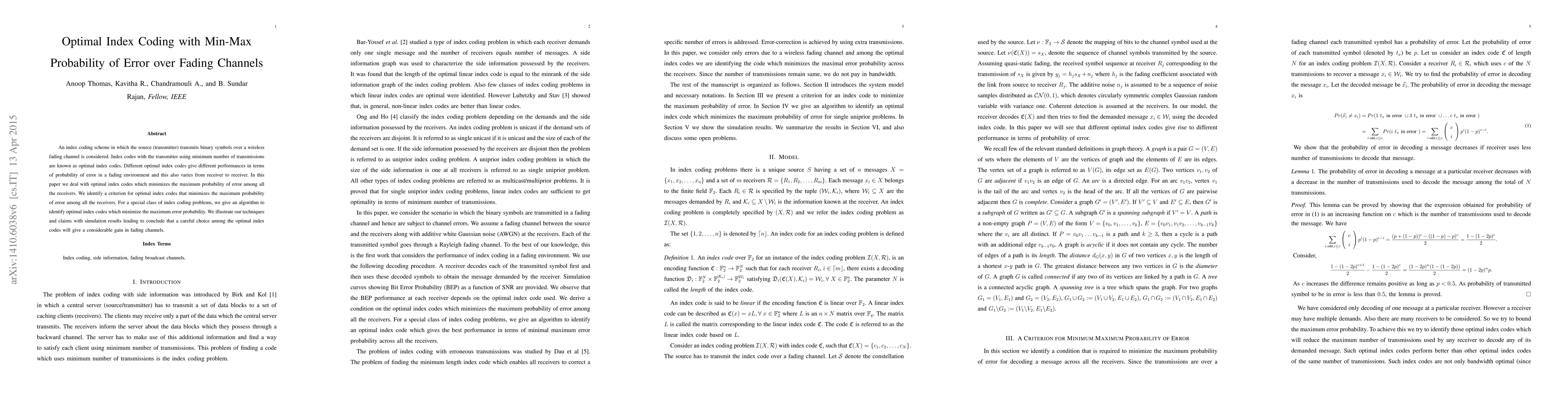 This paper explores optimal index coding schemes for minimizing the maximum probability of error over fading wireless channels. It identifies criteria for optimal index codes and provides an algorithm for a special class of problems, demonstrating significant performance gains through simulations.