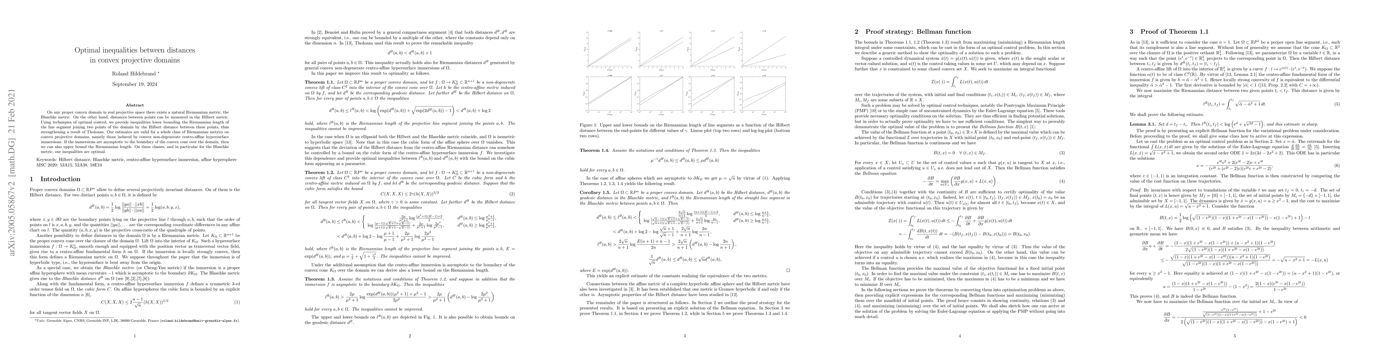 This paper establishes optimal inequalities between the distances measured by the Riemannian Blaschke metric and the Hilbert metric in convex projective domains. Using optimal control techniques, it provides lower bounds for the Riemannian length of line segments and, under certain conditions, upper bounds, demonstrating optimality for specific classes of metrics.