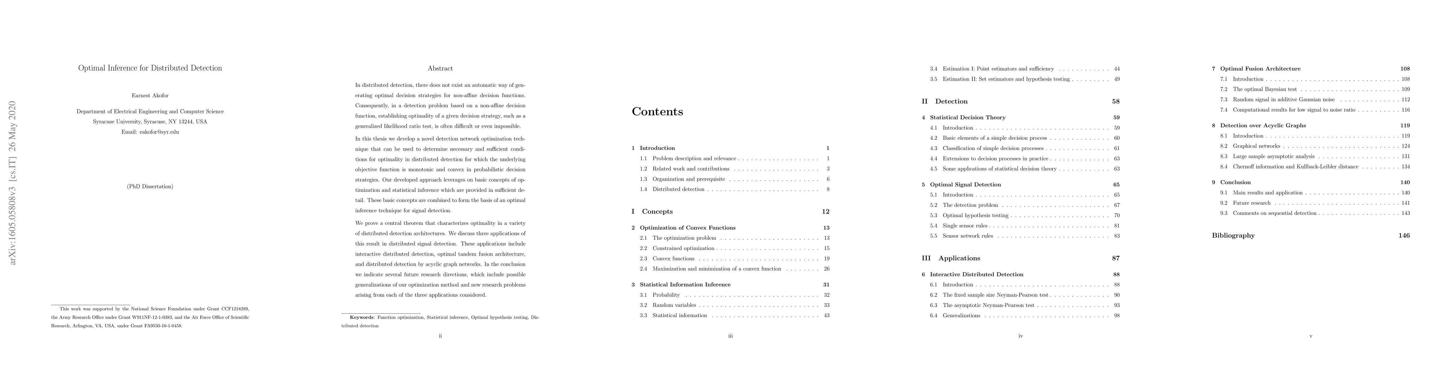 In distributed detection, there does not exist an automatic way of generating optimal decision strategies for non-affine decision functions. Consequently, in a detection problem based on a non-affine decision function, establishing optimality of a given decision strategy, such as a generalized likelihood ratio test, is often difficult or even impossible. In this thesis we develop a novel detection network optimization technique that can be used to determine necessary and sufficient conditions for optimality in distributed detection for which the underlying objective function is monotonic and convex in probabilistic decision strategies. Our developed approach leverages on basic concepts of optimization and statistical inference which are provided in sufficient detail. These basic concepts are combined to form the basis of an optimal inference technique for signal detection. We prove a central theorem that characterizes optimality in a variety of distributed detection architectures. We discuss three applications of this result in distributed signal detection. These applications include interactive distributed detection, optimal tandem fusion architecture, and distributed detection by acyclic graph networks. In the conclusion we indicate several future research directions, which include possible generalizations of our optimization method and new research problems arising from each of the three applications considered.