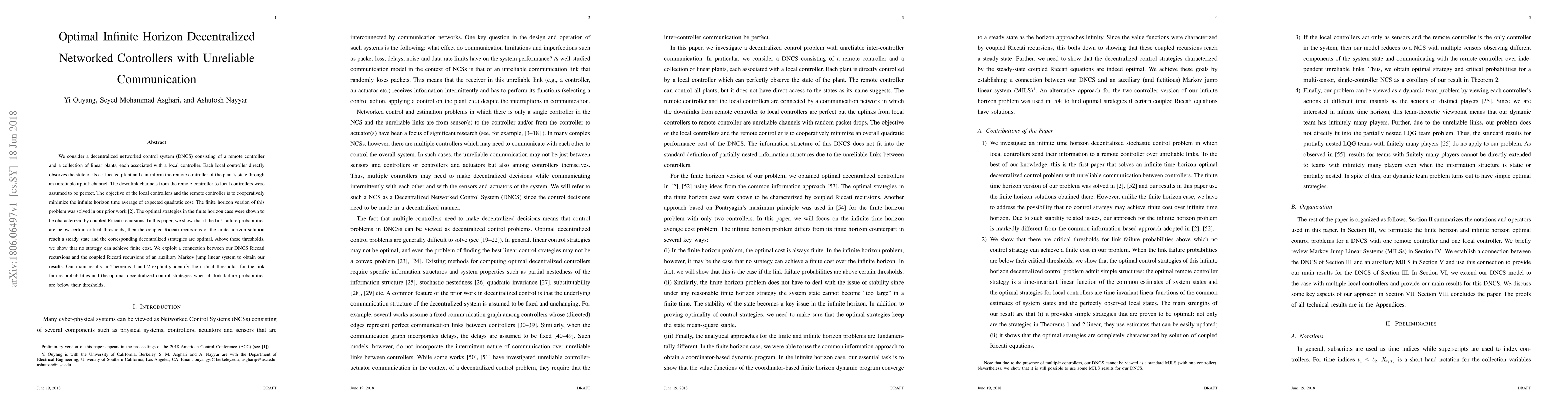 We consider a decentralized networked control system (DNCS) consisting of a remote controller and a collection of linear plants, each associated with a local controller. Each local controller directly observes the state of its co-located plant and can inform the remote controller of the plant's state through an unreliable uplink channel. The downlink channels from the remote controller to local controllers were assumed to be perfect. The objective of the local controllers and the remote controller is to cooperatively minimize the infinite horizon time average of expected quadratic cost. The finite horizon version of this problem was solved in our prior work [2]. The optimal strategies in the finite horizon case were shown to be characterized by coupled Riccati recursions. In this paper, we show that if the link failure probabilities are below certain critical thresholds, then the coupled Riccati recursions of the finite horizon solution reach a steady state and the corresponding decentralized strategies are optimal. Above these thresholds, we show that no strategy can achieve finite cost. We exploit a connection between our DNCS Riccati recursions and the coupled Riccati recursions of an auxiliary Markov jump linear system to obtain our results. Our main results in Theorems 1 and 2 explicitly identify the critical thresholds for the link failure probabilities and the optimal decentralized control strategies when all link failure probabilities are below their thresholds.