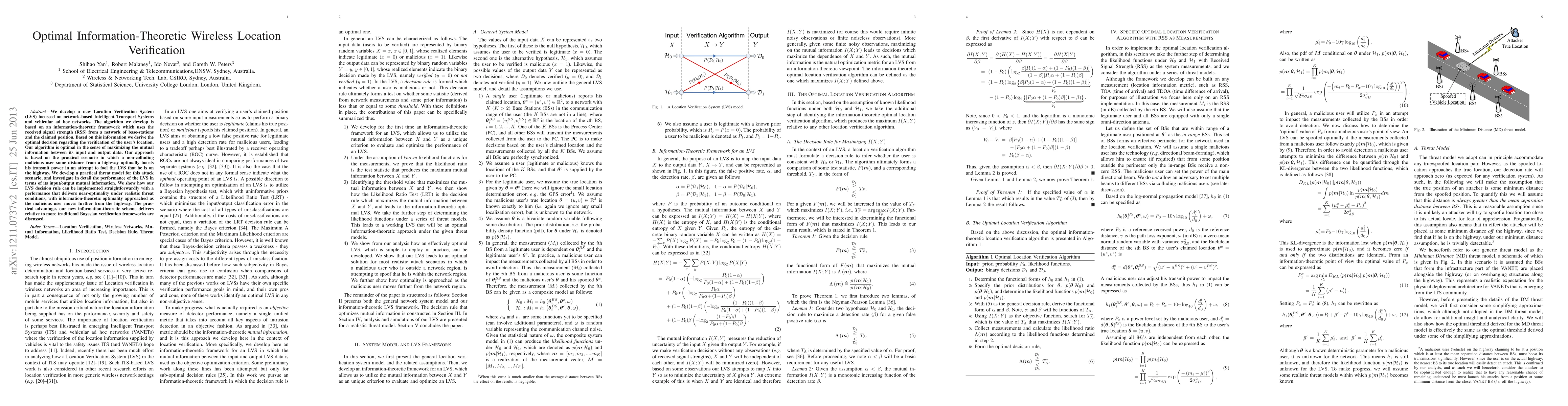 This paper proposes an optimal information-theoretic Location Verification System (LVS) for Intelligent Transport Systems and vehicular ad hoc networks, using received signal strength to verify user locations. The developed algorithm maximizes mutual information between input and output data, effectively countering non-colluding malicious users attempting to spoof their location.