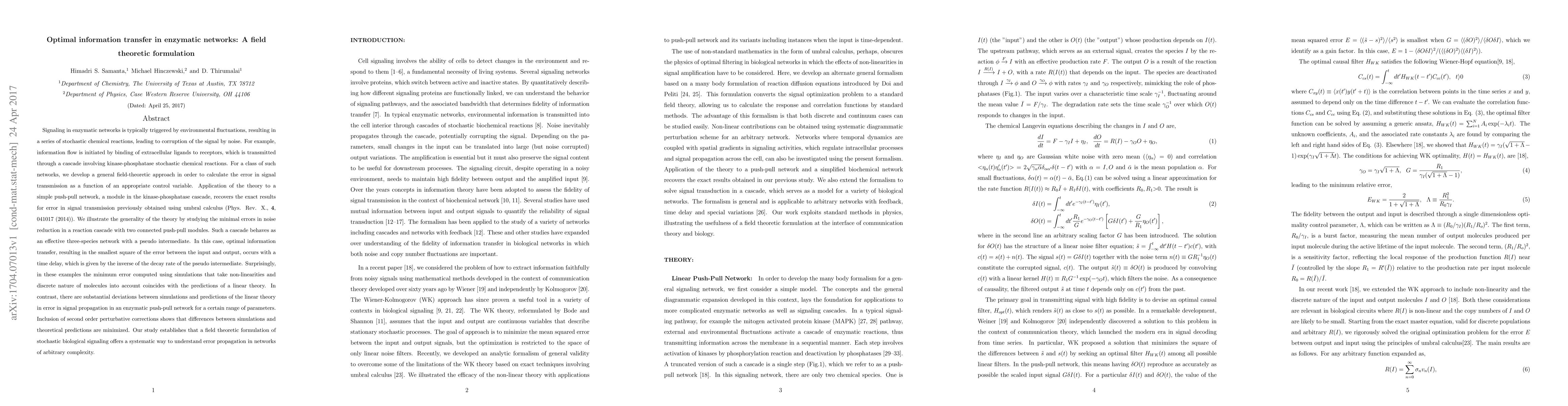 Researchers develop a field-theoretic approach to study error propagation in enzymatic networks, finding that optimal information transfer occurs with a time delay dependent on the decay rate of intermediate species, offering a systematic way to understand signal corruption.