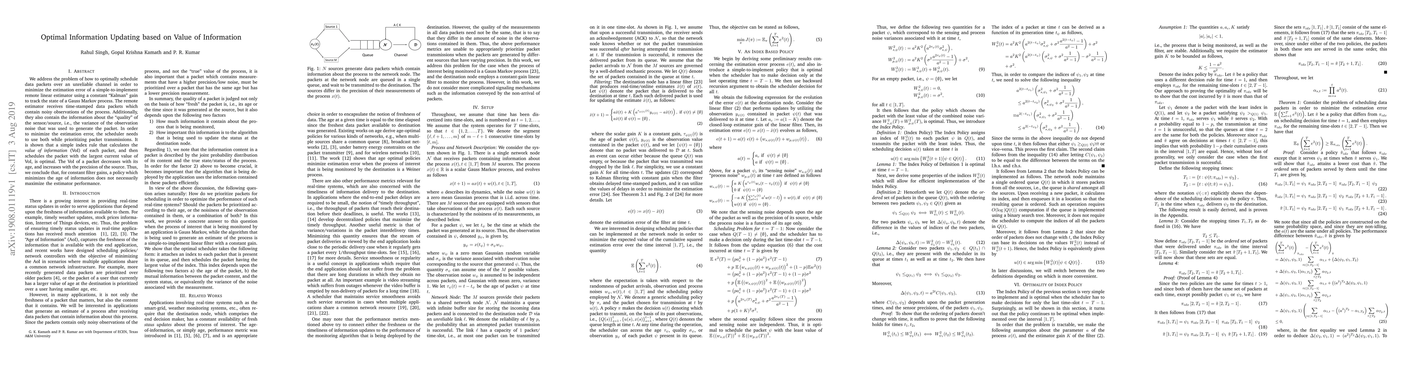 We address the problem of how to optimally schedule data packets over an unreliable channel in order to minimize the estimation error of a simple-to-implement remote linear estimator using a constant "Kalman'' gain to track the state of a Gauss Markov process. The remote estimator receives time-stamped data packets which contain noisy observations of the process. Additionally, they also contain the information about the "quality'' of the sensor\ source, i.e., the variance of the observation noise that was used to generate the packet. In order to minimize the estimation error, the scheduler needs to use both while prioritizing packet transmissions. It is shown that a simple index rule that calculates the value of information (VoI) of each packet, and then schedules the packet with the largest current value of VoI, is optimal. The VoI of a packet decreases with its age, and increases with the precision of the source. Thus, we conclude that, for constant filter gains, a policy which minimizes the age of information does not necessarily maximize the estimator performance.