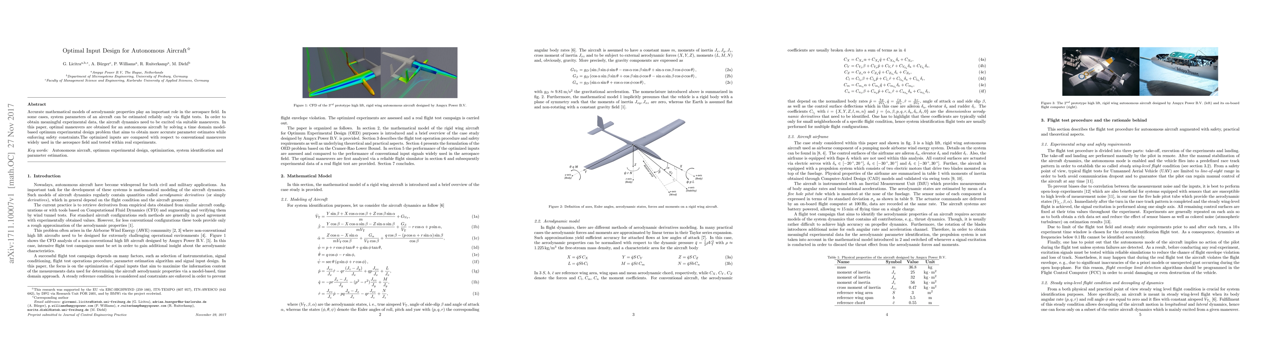 Accurate mathematical models of aerodynamic properties play an important role in the aerospace field. In some cases, system parameters of an aircraft can be estimated reliably only via flight tests. In order to obtain meaningful experimental data, the aircraft dynamics need to be excited via suitable maneuvers. In this paper, optimal maneuvers are obtained for an autonomous aircraft by solving a time domain model-based optimum experimental design problem that aims to obtain more accurate parameter estimates while enforcing safety constraints.The optimized inputs are compared with respect to conventional maneuvers widely used in the aerospace field and tested within real experiments.