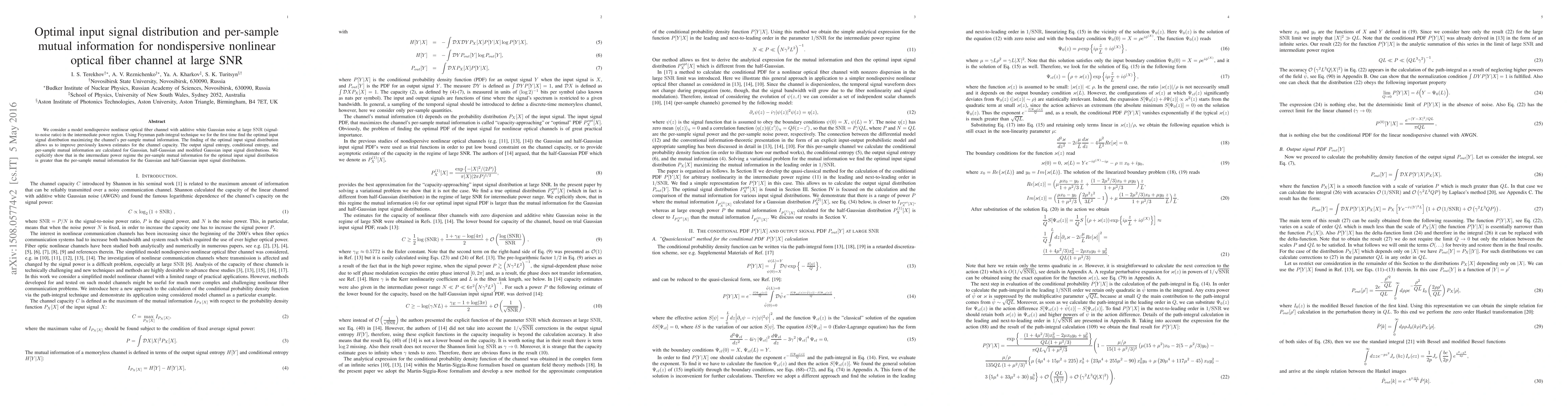 This paper investigates a nondispersive nonlinear optical fiber channel with additive white Gaussian noise at high SNR, determining the optimal input signal distribution that maximizes per-sample mutual information using Feynman path-integral techniques. It shows that the optimal distribution improves channel capacity estimates and outperforms Gaussian and half-Gaussian distributions in the intermediate power regime.