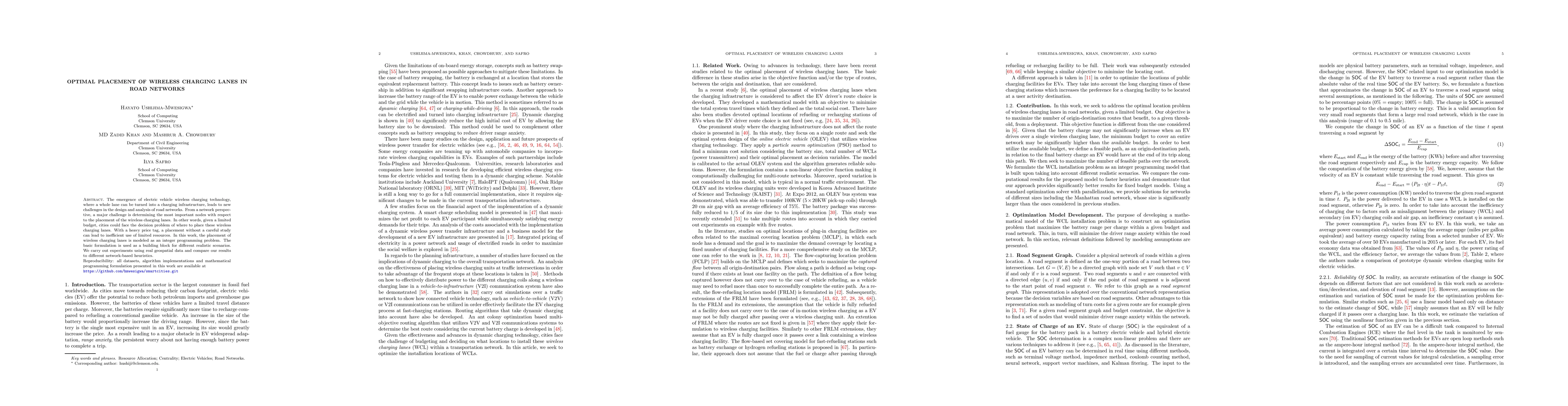 This paper models the optimal installation of wireless charging lanes for electric vehicles as an integer programming problem, aiming to minimize range anxiety while maximizing efficiency within budget constraints. The authors test their model against various heuristics using real geospatial data to determine the best locations for charging units.