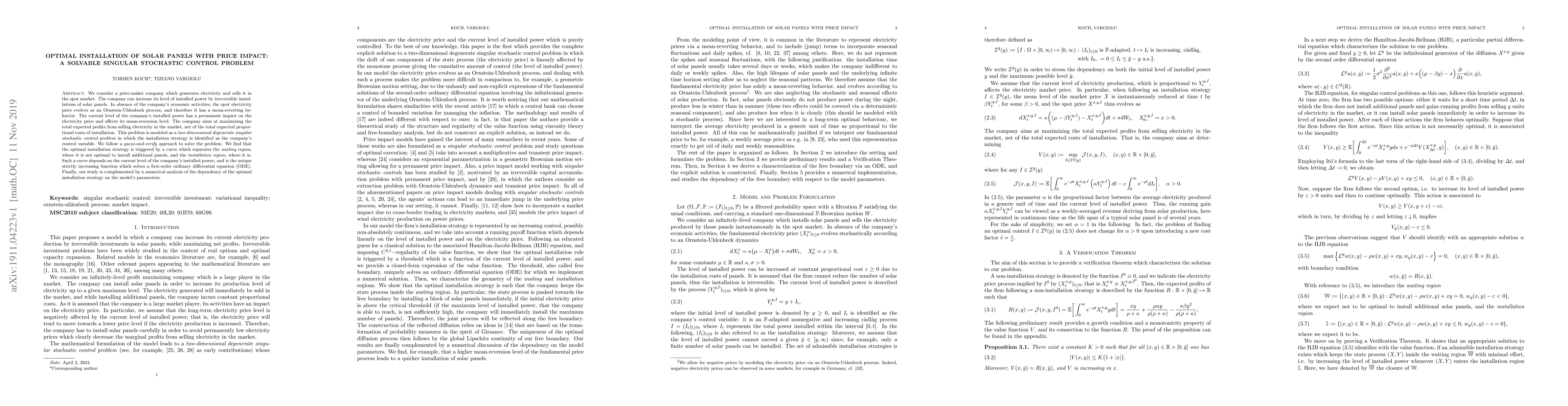 This paper models a company's optimal strategy for installing solar panels to maximize profits while considering the price impact of its installed power on the spot electricity market. The optimal installation strategy is determined by a curve that separates regions where installation is and is not optimal, solved via a guess-and-verify approach.