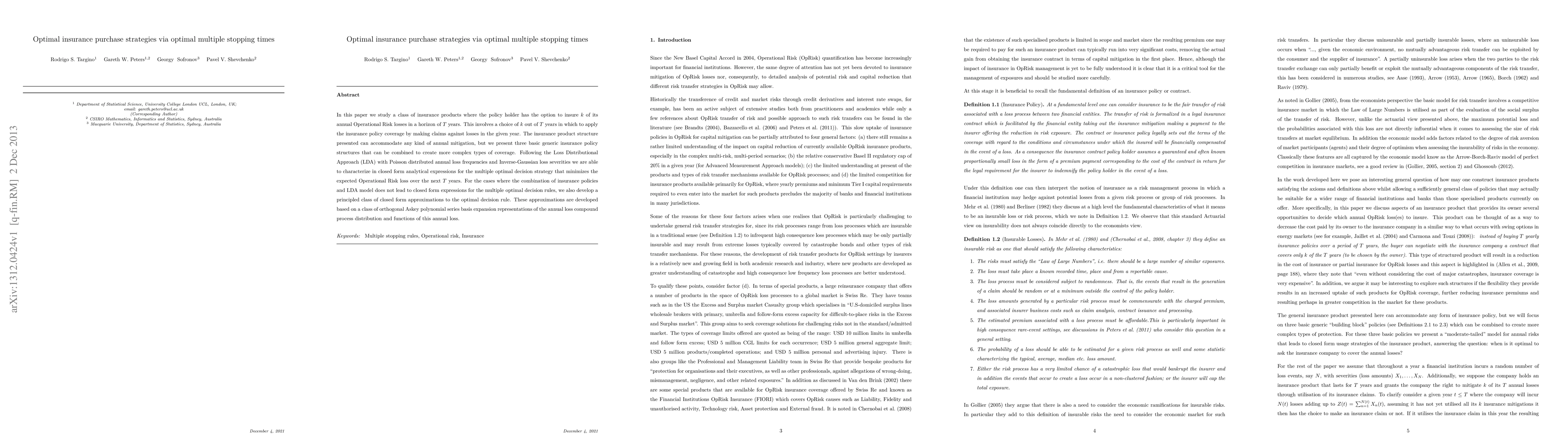 In this paper we study a class of insurance products where the policy holder has the option to insure $k$ of its annual Operational Risk losses in a horizon of $T$ years. This involves a choice of $k$ out of $T$ years in which to apply the insurance policy coverage by making claims against losses in the given year. The insurance product structure presented can accommodate any kind of annual mitigation, but we present three basic generic insurance policy structures that can be combined to create more complex types of coverage. Following the Loss Distributional Approach (LDA) with Poisson distributed annual loss frequencies and Inverse-Gaussian loss severities we are able to characterize in closed form analytical expressions for the multiple optimal decision strategy that minimizes the expected Operational Risk loss over the next $T$ years. For the cases where the combination of insurance policies and LDA model does not lead to closed form expressions for the multiple optimal decision rules, we also develop a principled class of closed form approximations to the optimal decision rule. These approximations are developed based on a class of orthogonal Askey polynomial series basis expansion representations of the annual loss compound process distribution and functions of this annual loss.