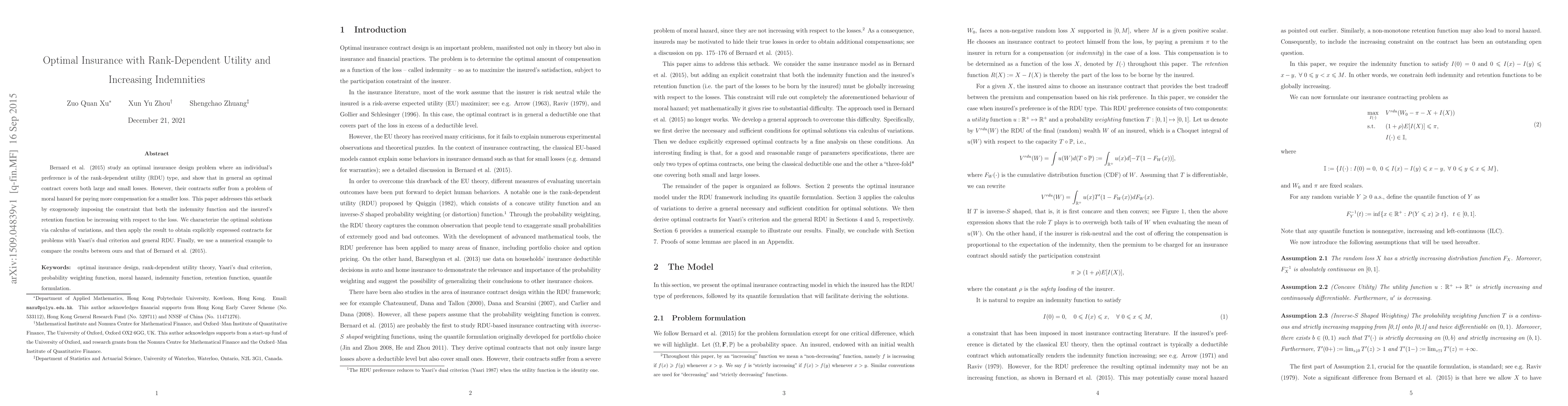 This paper optimizes insurance contracts under rank-dependent utility, addressing moral hazard by enforcing increasing indemnity and retention functions. It characterizes optimal solutions via calculus of variations and compares results numerically with Bernard et al. (2015).