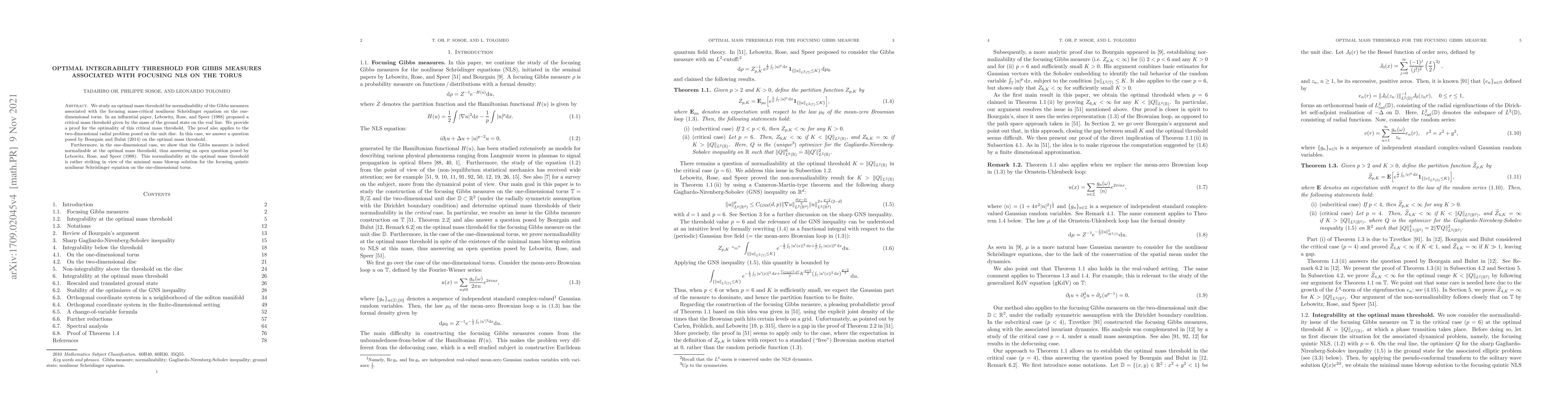 This paper proves the optimal mass threshold for normalizability of Gibbs measures associated with the focusing mass-critical nonlinear Schrödinger equation on the torus, confirming the threshold proposed by Lebowitz, Rose, and Speer (1988). It also demonstrates normalizability at this threshold in the one-dimensional case, resolving an open question.