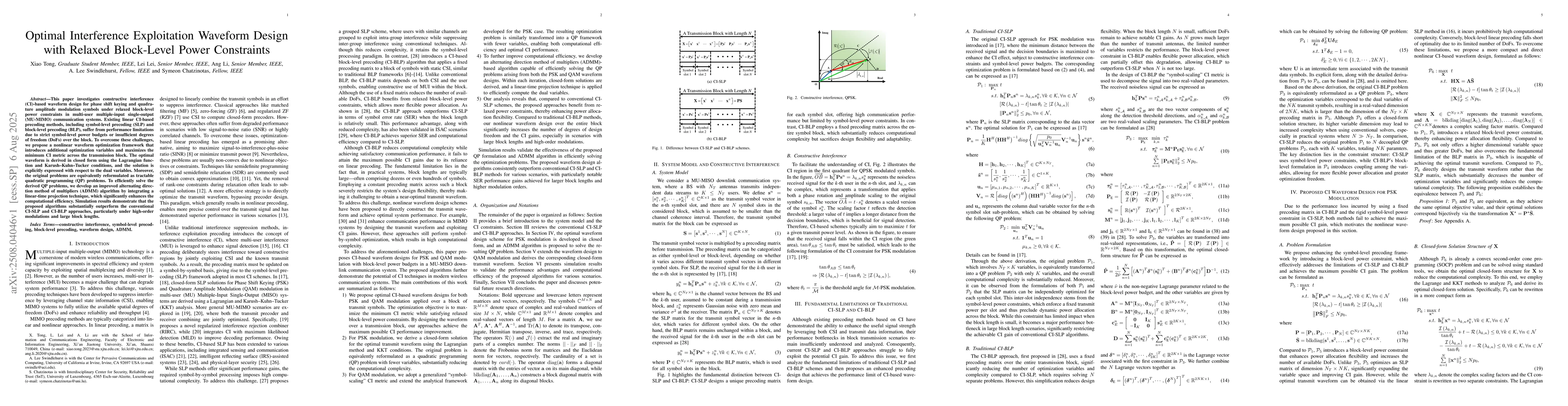 This paper investigates constructive interference (CI)-based waveform design for phase shift keying and quadrature amplitude modulation symbols under relaxed block-level power constraints in multi-user multiple-input single-output (MU-MIMO) communication systems. Existing linear CI-based precoding methods, including symbol-level precoding (SLP) and block-level precoding (BLP), suffer from performance limitations due to strict symbol-level power budgets or insufficient degrees of freedom over the block. To overcome these challenges, we propose a nonlinear waveform optimization framework that introduces additional optimization variables and maximizes the minimum CI metric across the transmission block. The optimal waveform is derived in closed form using the function and Karush Kuhn Tucker conditions, and the solution is explicitly expressed with respect to the dual variables. Moreover, the original problems are equivalently reformulated as tractable quadratic programming (QP) problems. To efficiently solve the derived QP problems, we develop an improved alternating direction method of multipliers (ADMM) algorithm by integrating a linear-time projection technique, which significantly enhances the computational efficiency. Simulation results demonstrate that the proposed algorithms substantially outperform the conventional CI-SLP and CI-BLP approaches, particularly under high-order modulations and large block lengths.