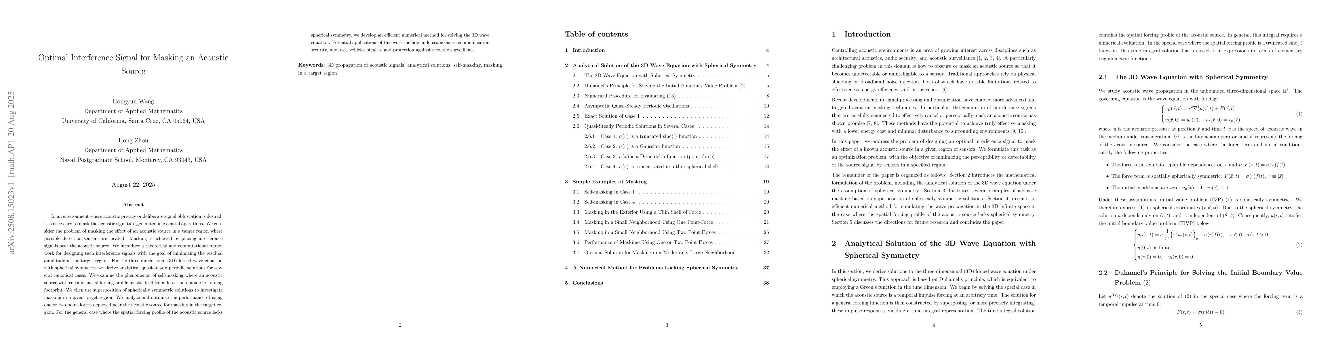 In an environment where acoustic privacy or deliberate signal obfuscation is desired, it is necessary to mask the acoustic signature generated in essential operations. We consider the problem of masking the effect of an acoustic source in a target region where possible detection sensors are located. Masking is achieved by placing interference signals near the acoustic source. We introduce a theoretical and computational framework for designing such interference signals with the goal of minimizing the residual amplitude in the target region. For the three-dimensional (3D) forced wave equation with spherical symmetry, we derive analytical quasi-steady periodic solutions for several canonical cases. We examine the phenomenon of self-masking where an acoustic source with certain spatial forcing profile masks itself from detection outside its forcing footprint. We then use superposition of spherically symmetric solutions to investigate masking in a given target region. We analyze and optimize the performance of using one or two point-forces deployed near the acoustic source for masking in the target region. For the general case where the spatial forcing profile of the acoustic source lacks spherical symmetry, we develop an efficient numerical method for solving the 3D wave equation. Potential applications of this work include undersea acoustic communication security, undersea vehicles stealth, and protection against acoustic surveillance.