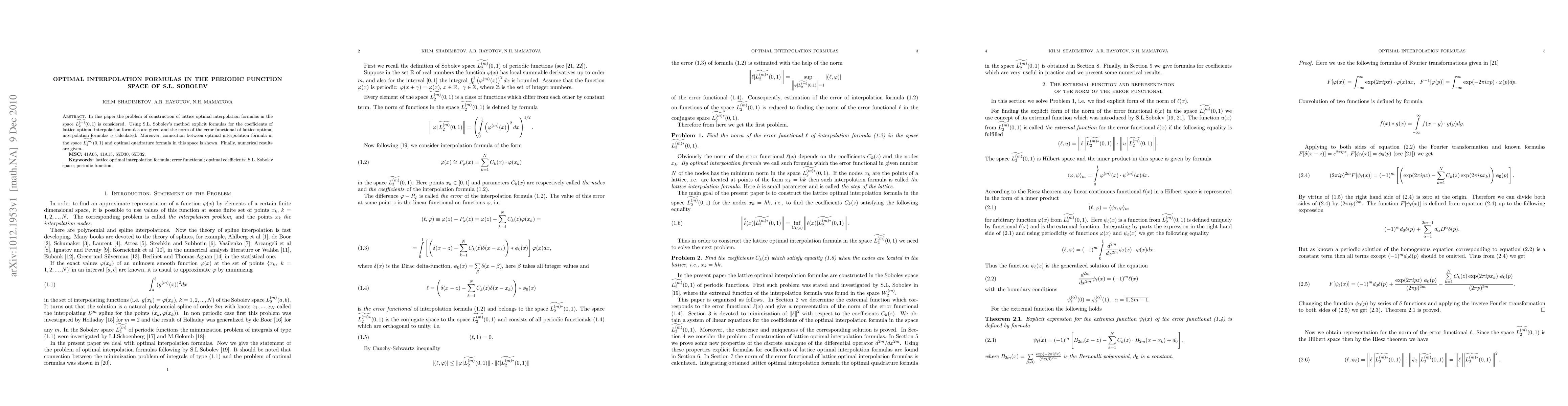 This paper constructs lattice optimal interpolation formulas in the periodic function space $\widetilde{L_2^{(m)}} (0,1)$ using S.L. Sobolev's method, providing explicit formulas for coefficients and calculating the error norm, and it establishes a link between optimal interpolation and quadrature formulas in this space, supplemented by numerical results.