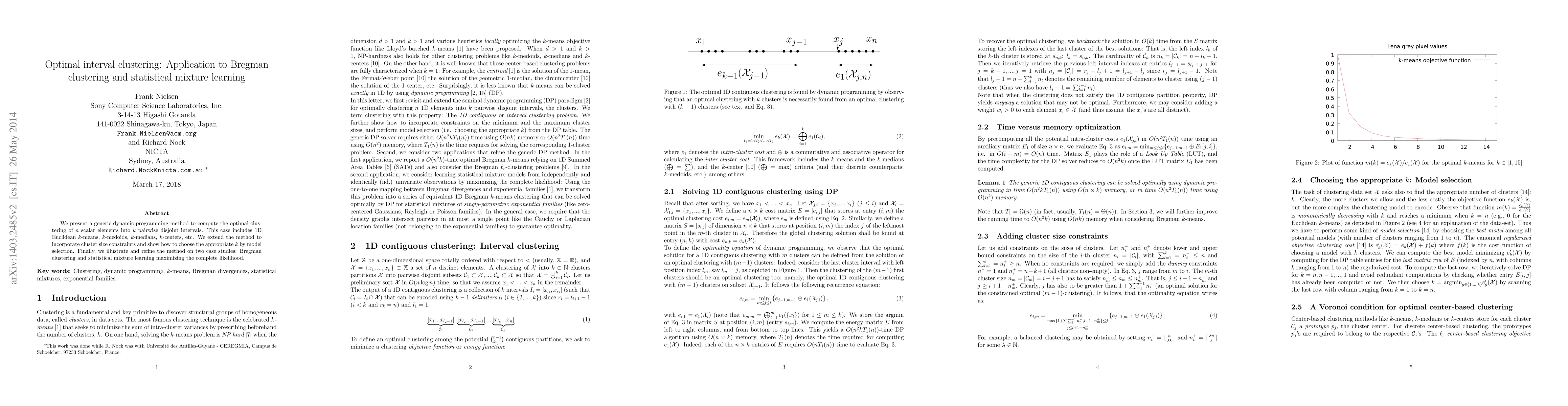 This paper presents a dynamic programming method to find optimal interval clustering for various algorithms, including Bregman clustering and statistical mixture learning, with applications in data analysis and machine learning.