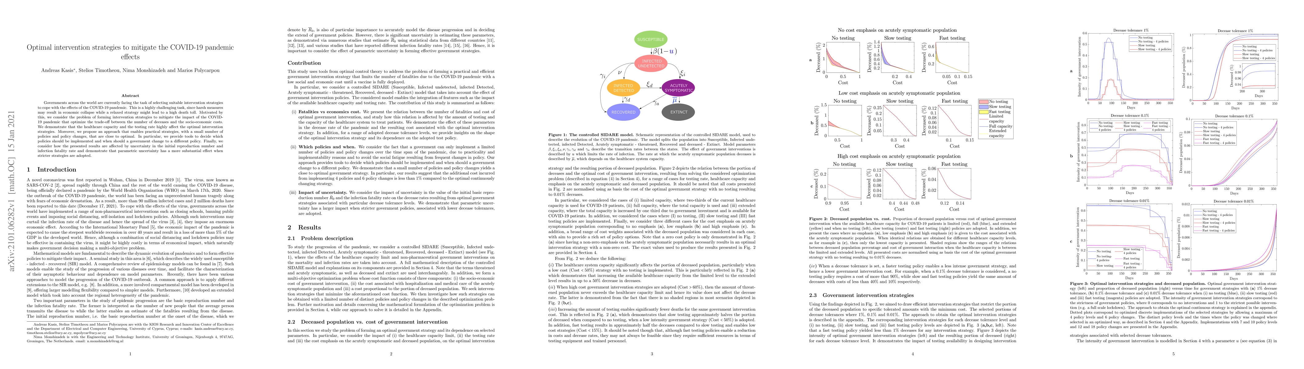 Governments across the world are currently facing the task of selecting suitable intervention strategies to cope with the effects of the COVID-19 pandemic. This is a highly challenging task, since harsh measures may result in economic collapse while a relaxed strategy might lead to a high death toll. Motivated by this, we consider the problem of forming intervention strategies to mitigate the impact of the COVID-19 pandemic that optimize the trade-off between the number of deceases and the socio-economic costs. We demonstrate that the healthcare capacity and the testing rate highly affect the optimal intervention strategies. Moreover, we propose an approach that enables practical strategies, with a small number of policies and policy changes, that are close to optimal. In particular, we provide tools to decide which policies should be implemented and when should a government change to a different policy. Finally, we consider how the presented results are affected by uncertainty in the initial reproduction number and infection fatality rate and demonstrate that parametric uncertainty has a more substantial effect when stricter strategies are adopted.