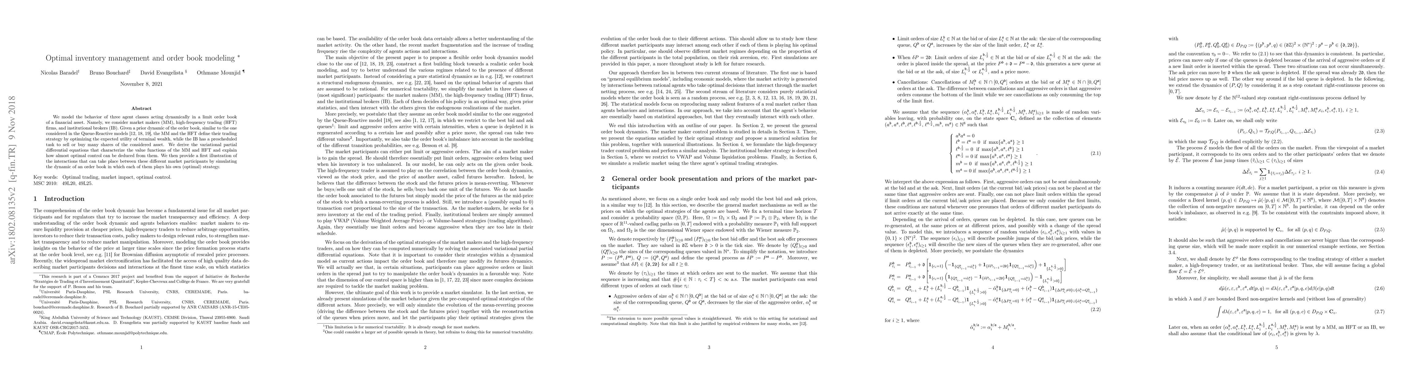 We model the behavior of three agent classes acting dynamically in a limit order book of a financial asset. Namely, we consider market makers (MM), high-frequency trading (HFT) firms, and institutional brokers (IB). Given a prior dynamic of the order book, similar to the one considered in the Queue-Reactive models [14, 20, 21], the MM and the HFT define their trading strategy by optimizing the expected utility of terminal wealth, while the IB has a prescheduled task to sell or buy many shares of the considered asset. We derive the variational partial differential equations that characterize the value functions of the MM and HFT and explain how almost optimal control can be deduced from them. We then provide a first illustration of the interactions that can take place between these different market participants by simulating the dynamic of an order book in which each of them plays his own (optimal) strategy.