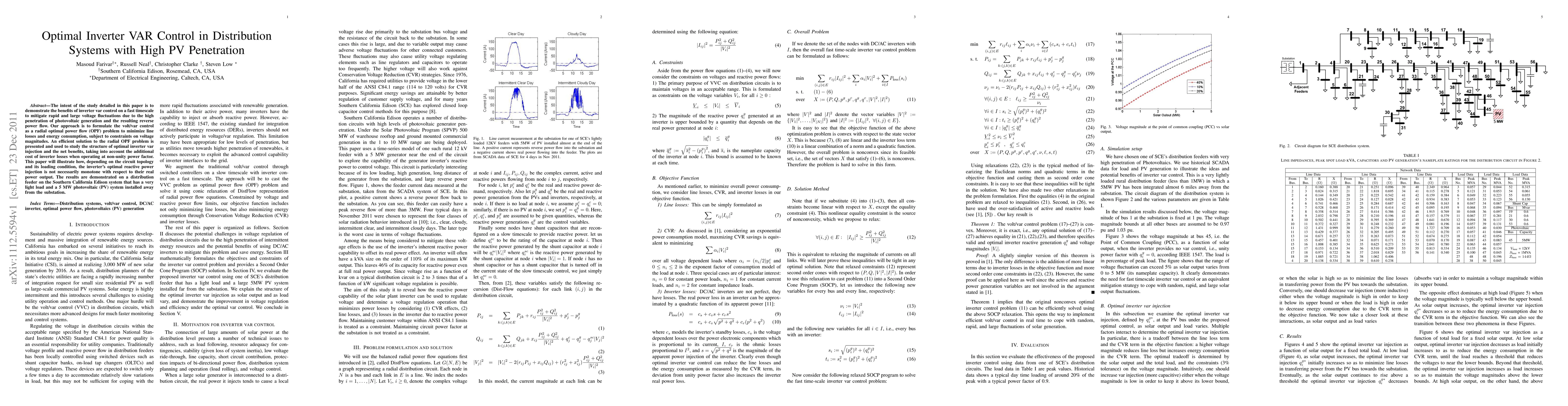 The intent of the study detailed in this paper is to demonstrate the benefits of inverter var control on a fast timescale to mitigate rapid and large voltage fluctuations due to the high penetration of photovoltaic generation and the resulting reverse power flow. Our approach is to formulate the volt/var control as a radial optimal power flow (OPF) problem to minimize line losses and energy consumption, subject to constraints on voltage magnitudes. An efficient solution to the radial OPF problem is presented and used to study the structure of optimal inverter var injection and the net benefits, taking into account the additional cost of inverter losses when operating at non-unity power factor. This paper will illustrate how, depending on the circuit topology and its loading condition, the inverter's optimal reactive power injection is not necessarily monotone with respect to their real power output. The results are demonstrated on a distribution feeder on the Southern California Edison system that has a very light load and a 5 MW photovoltaic (PV) system installed away from the substation.
