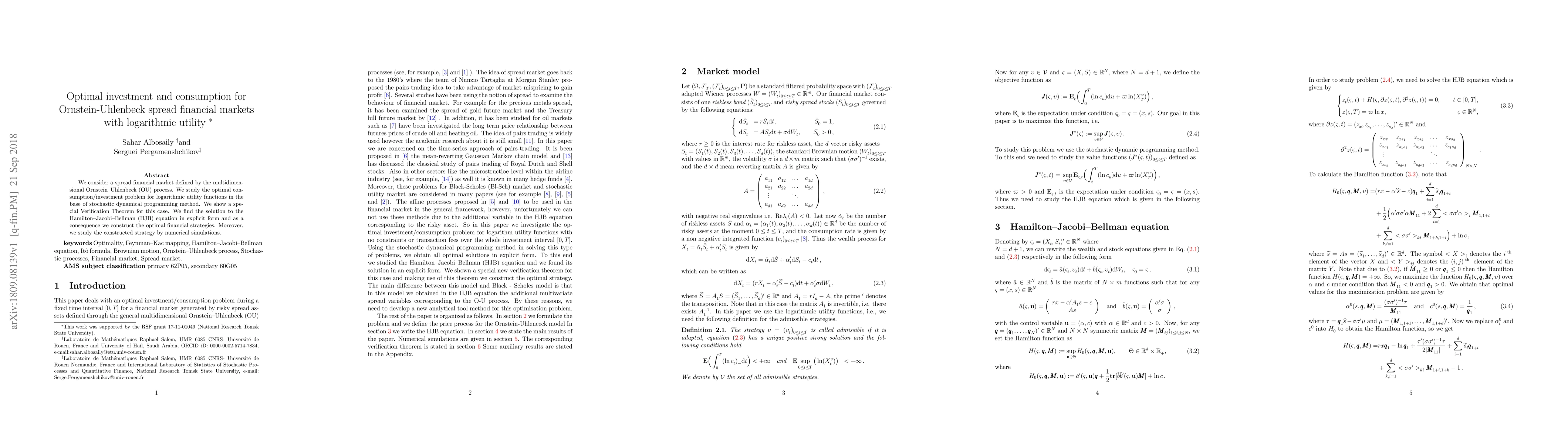 We consider a spread financial market defined by the multidimensional Ornstein--Uhlenbeck (OU) process. We study the optimal consumption/investment problem for logarithmic utility functions in the base of stochastic dynamical programming method. We show a special Verification Theorem for this case. We find the solution to the Hamilton--Jacobi--Bellman (HJB) equation in explicit form and as a consequence we construct the optimal financial strategies. Moreover, we study the constructed strategy by numerical simulations.