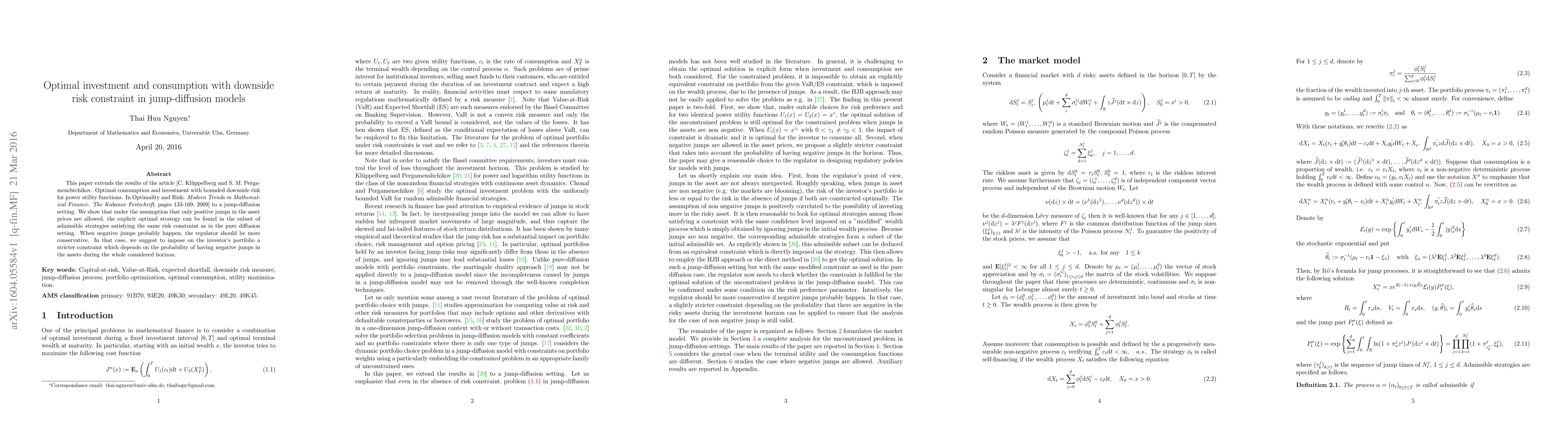This paper extends optimal investment and consumption strategies under downside risk constraints from diffusion models to jump-diffusion settings, showing that positive jumps allow for similar strategies as in pure diffusion, while negative jumps necessitate stricter risk constraints based on their probability.