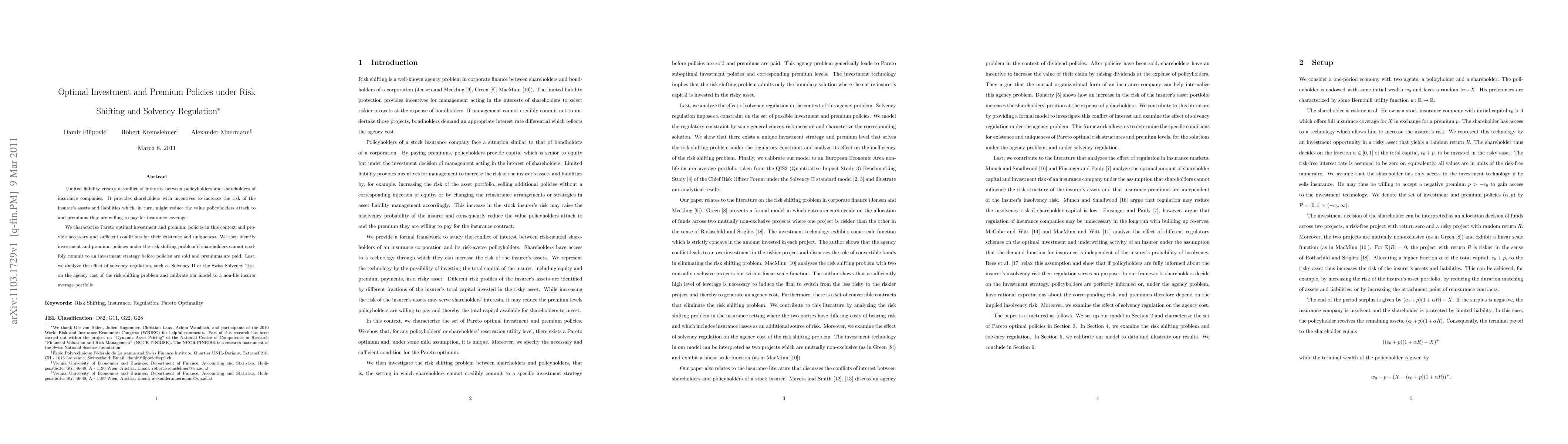 This paper investigates optimal investment and premium policies for insurance companies under risk shifting and solvency regulation, identifying conditions for their existence and uniqueness. It also examines the impact of regulatory frameworks like Solvency II on mitigating agency costs arising from conflicts between shareholders and policyholders.