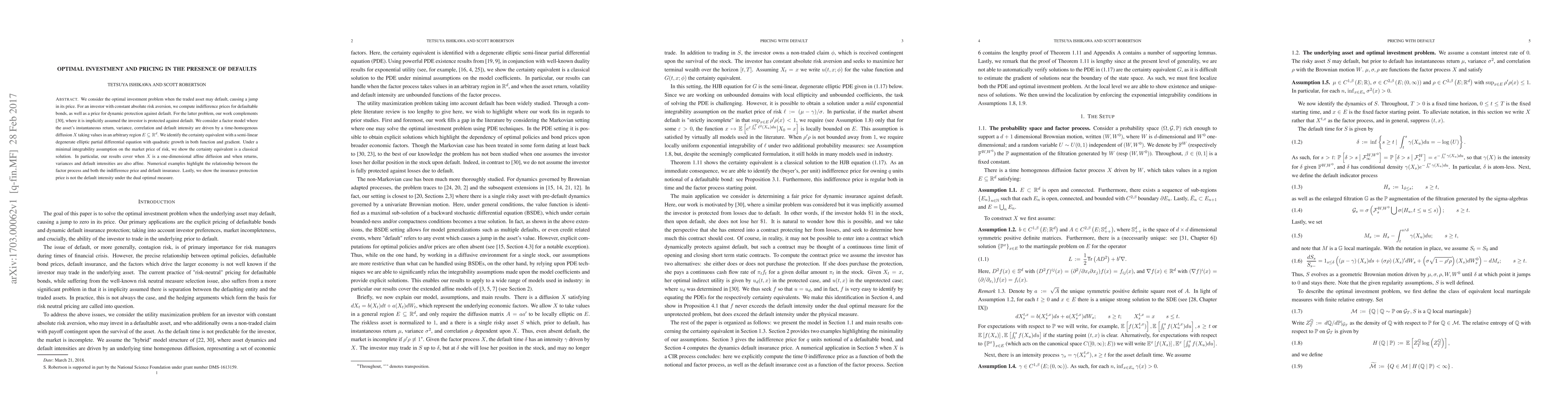 We consider the optimal investment problem when the traded asset may default, causing a jump in its price. For an investor with constant absolute risk aversion, we compute indifference prices for defaultable bonds, as well as a price for dynamic protection against default. For the latter problem, our work complements Sircar & Zariphopoulou (2007), where it is implicitly assumed the investor is protected against default. We consider a factor model where the asset's instantaneous return, variance, correlation and default intensity are driven by a time-homogenous diffusion X taking values in an arbitrary region E. We identify the certainty equivalent with a semi-linear degenerate elliptic partial differential equation with quadratic growth in both function and gradient. Under a minimal integrability assumption on the market price of risk, we show the certainty equivalent is a classical solution. In particular, our results cover when X is a one-dimensional affine diffusion and when returns, variances and default intensities are also affine. Numerical examples highlight the relationship between the factor process and both the indifference price and default insurance. Lastly, we show the insurance protection price is not the default intensity under the dual optimal measure.