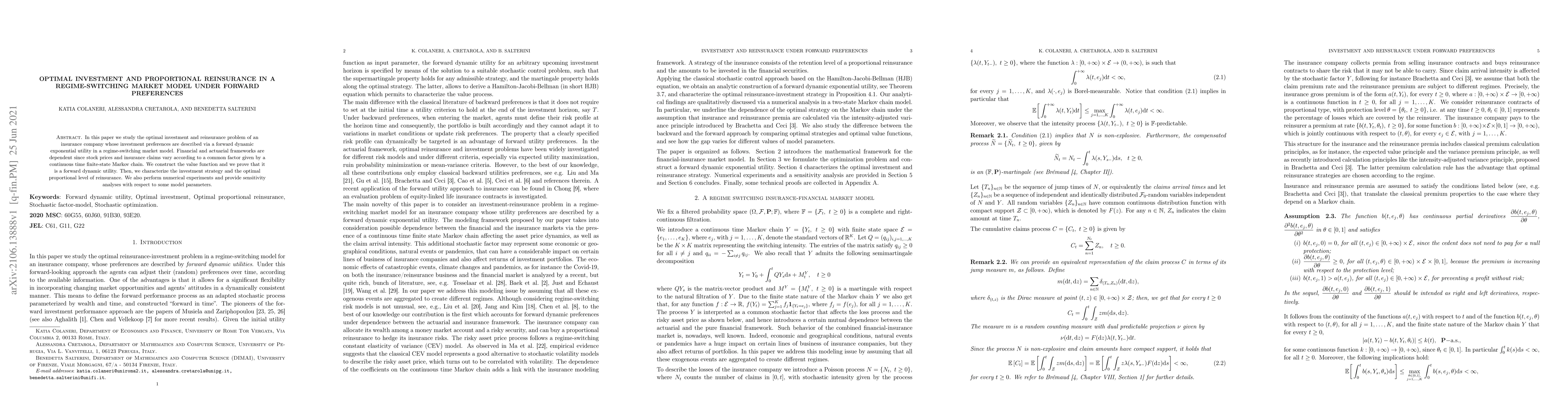 This paper investigates optimal investment and proportional reinsurance strategies for an insurance company in a regime-switching market model, using forward dynamic exponential utility. It constructs the value function and characterizes the optimal investment strategy and reinsurance level, supported by numerical experiments and sensitivity analyses.