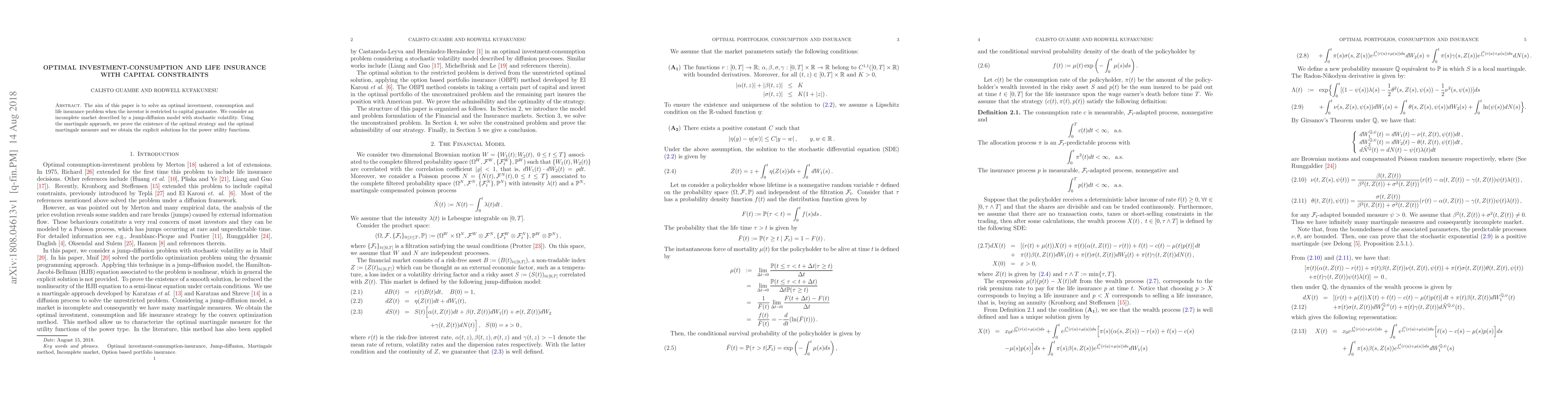 This paper addresses the optimal investment, consumption, and life insurance problem under capital guarantees in an incomplete market modeled by a jump-diffusion with stochastic volatility. The authors prove the existence of optimal strategies and measures using the martingale approach, and derive explicit solutions for power utility functions.