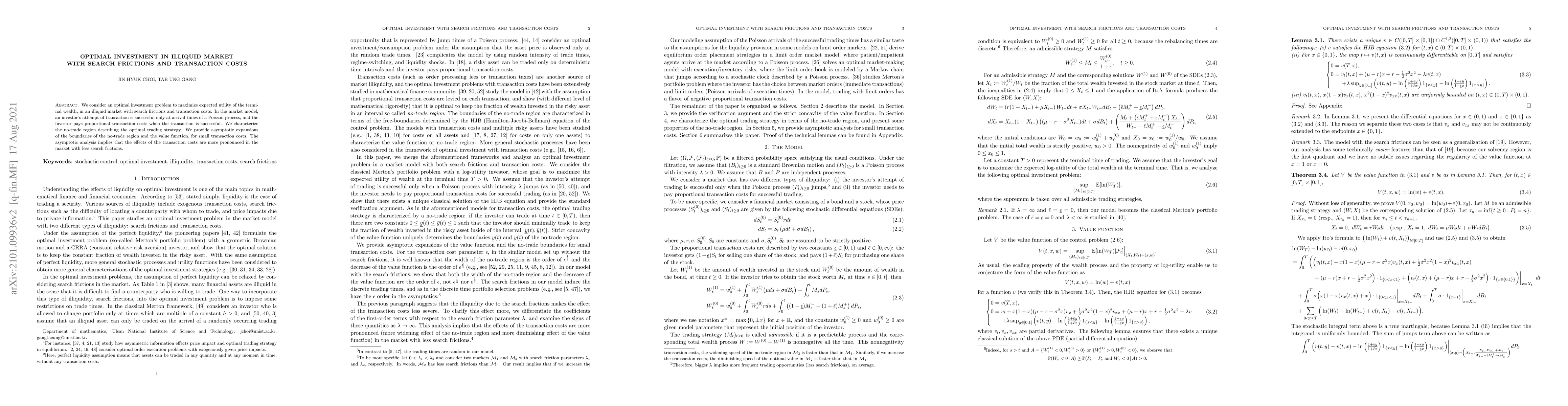 This paper studies an optimal investment strategy in an illiquid market with search frictions and transaction costs, characterizing the no-trade region and providing asymptotic expansions for small transaction costs, which show that transaction costs significantly impact investment decisions.