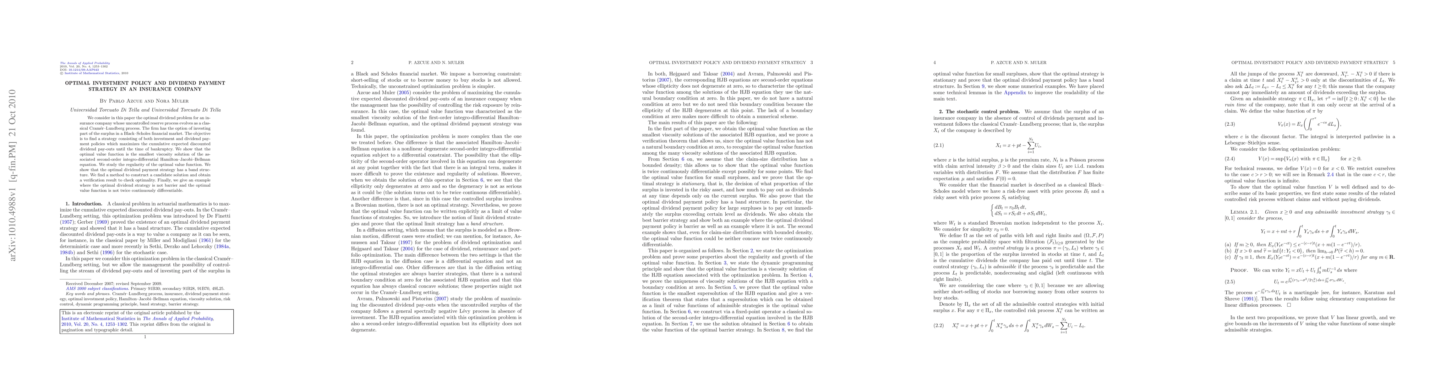 This paper investigates the optimal dividend and investment policy for an insurance company modeled by a Cramér-Lundberg process, aiming to maximize cumulative expected discounted dividends while avoiding bankruptcy. The optimal strategy is shown to be a viscosity solution of a Hamilton-Jacobi-Bellman equation, revealing a band structure in the dividend policy.