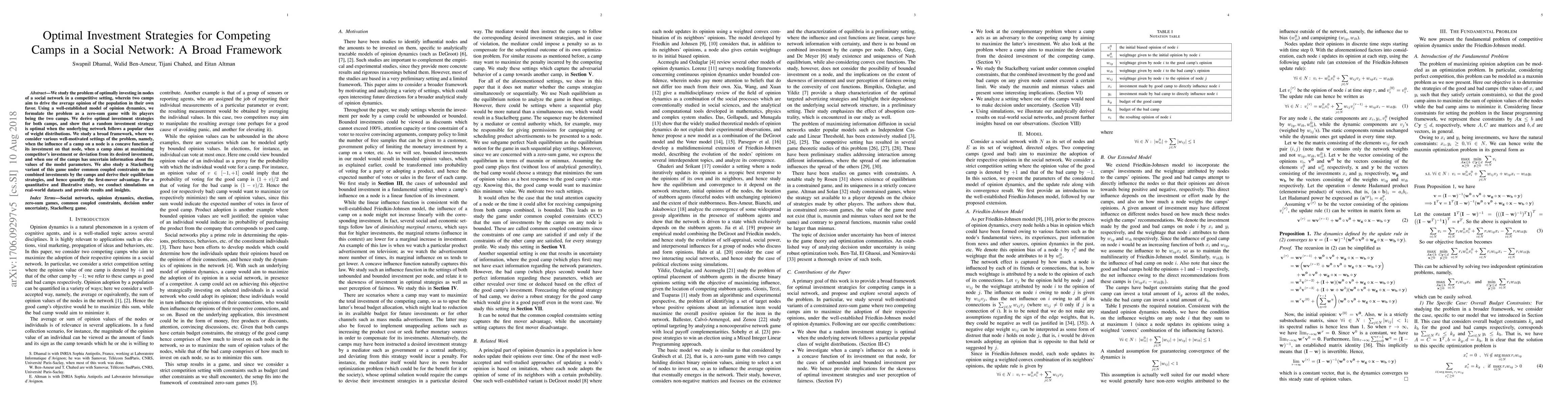 This paper investigates optimal investment strategies for two competing camps in a social network to influence public opinion. It formulates the problem as a zero-sum game and derives optimal strategies, showing that random investment is optimal under certain network conditions. It explores various settings and a Stackelberg variant, and provides insights through simulations on real datasets.