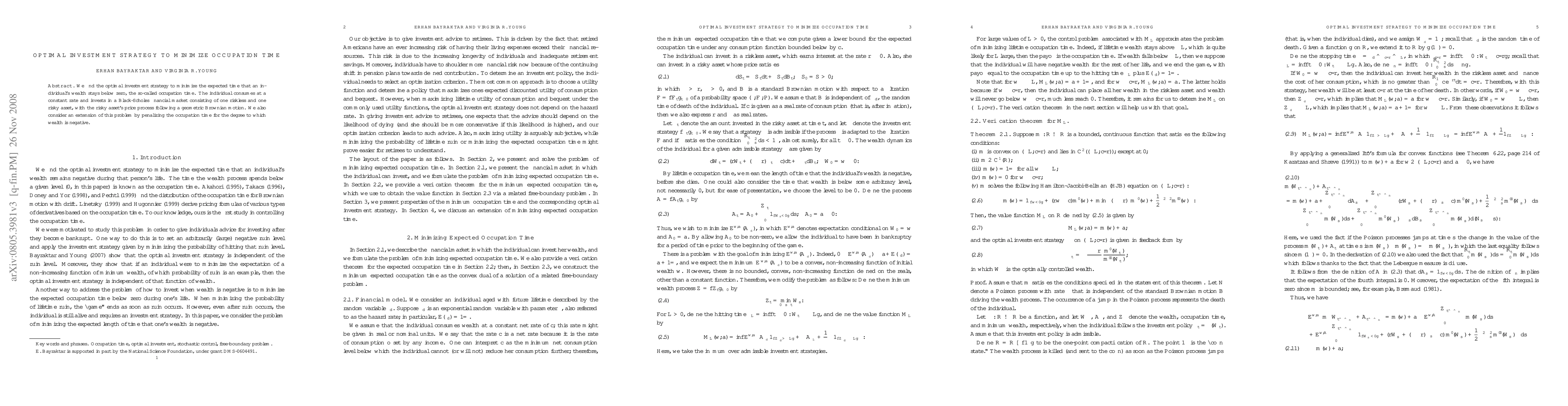 We find the optimal investment strategy to minimize the expected time that an individual's wealth stays below zero, the so-called {\it occupation time}. The individual consumes at a constant rate and invests in a Black-Scholes financial market consisting of one riskless and one risky asset, with the risky asset's price process following a geometric Brownian motion. We also consider an extension of this problem by penalizing the occupation time for the degree to which wealth is negative.