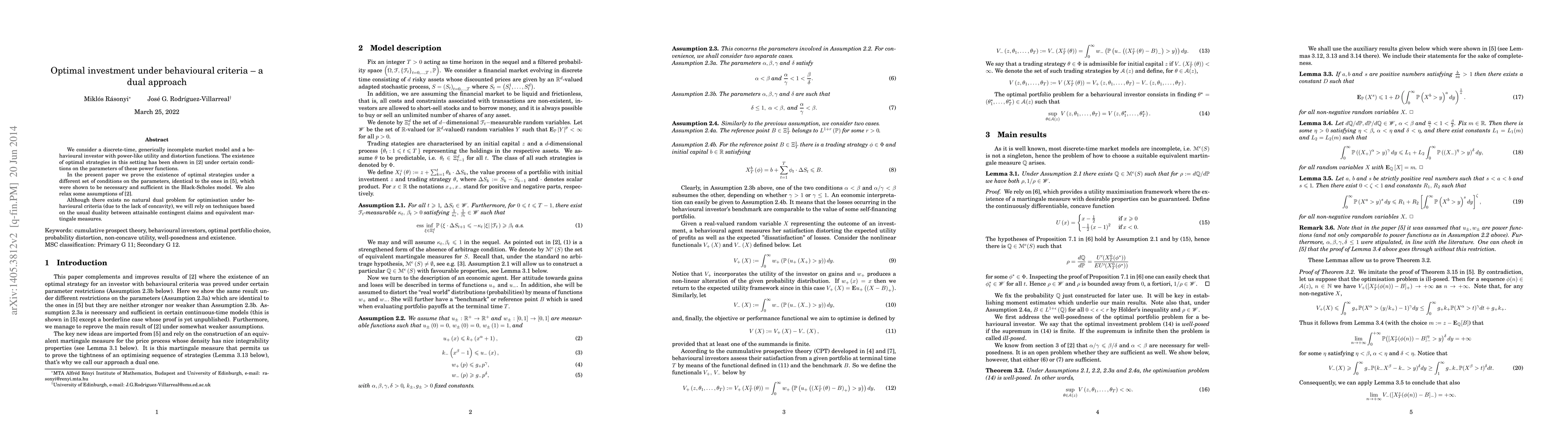 This paper proves the existence of optimal investment strategies for a behavioural investor in a generically incomplete market model under certain conditions on parameters. It uses duality techniques to find equivalent martingale measures and attainable contingent claims, despite the lack of concavity in the utility function.