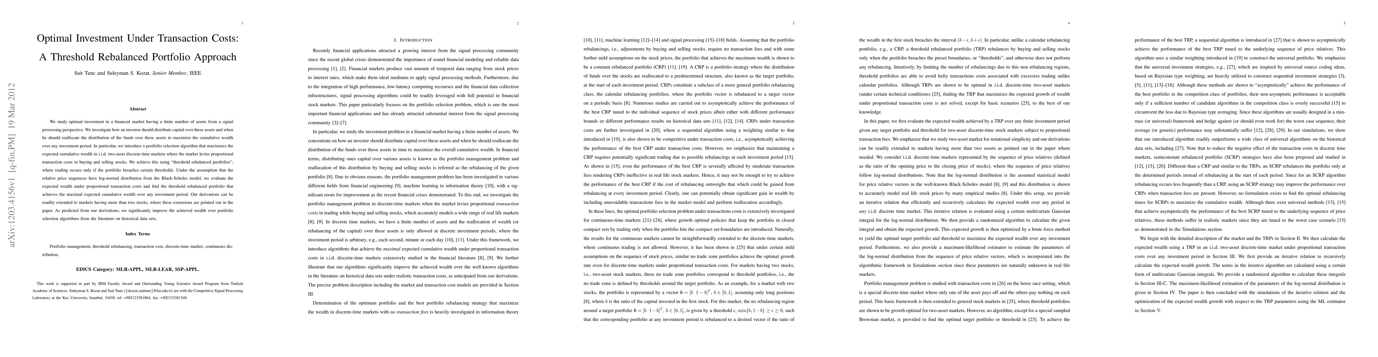 We study optimal investment in a financial market having a finite number of assets from a signal processing perspective. We investigate how an investor should distribute capital over these assets and when he should reallocate the distribution of the funds over these assets to maximize the cumulative wealth over any investment period. In particular, we introduce a portfolio selection algorithm that maximizes the expected cumulative wealth in i.i.d. two-asset discrete-time markets where the market levies proportional transaction costs in buying and selling stocks. We achieve this using "threshold rebalanced portfolios", where trading occurs only if the portfolio breaches certain thresholds. Under the assumption that the relative price sequences have log-normal distribution from the Black-Scholes model, we evaluate the expected wealth under proportional transaction costs and find the threshold rebalanced portfolio that achieves the maximal expected cumulative wealth over any investment period. Our derivations can be readily extended to markets having more than two stocks, where these extensions are pointed out in the paper. As predicted from our derivations, we significantly improve the achieved wealth over portfolio selection algorithms from the literature on historical data sets.