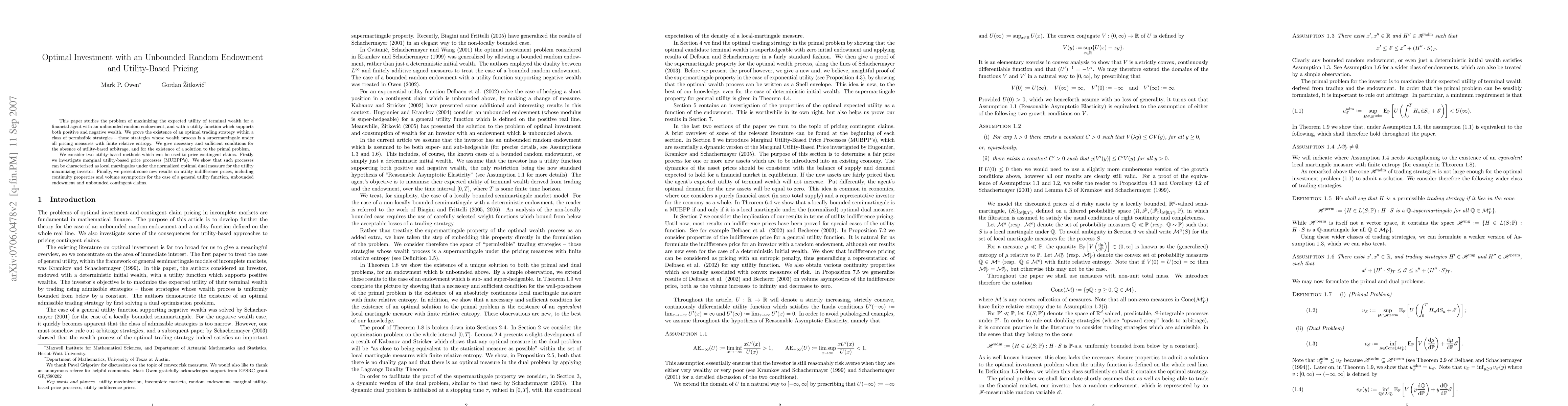 This paper explores optimal investment strategies for a financial agent with an unbounded random endowment, proving the existence of an optimal trading strategy that avoids utility-based arbitrage. It also investigates utility-based pricing methods, including marginal utility-based price processes and utility indifference prices.
