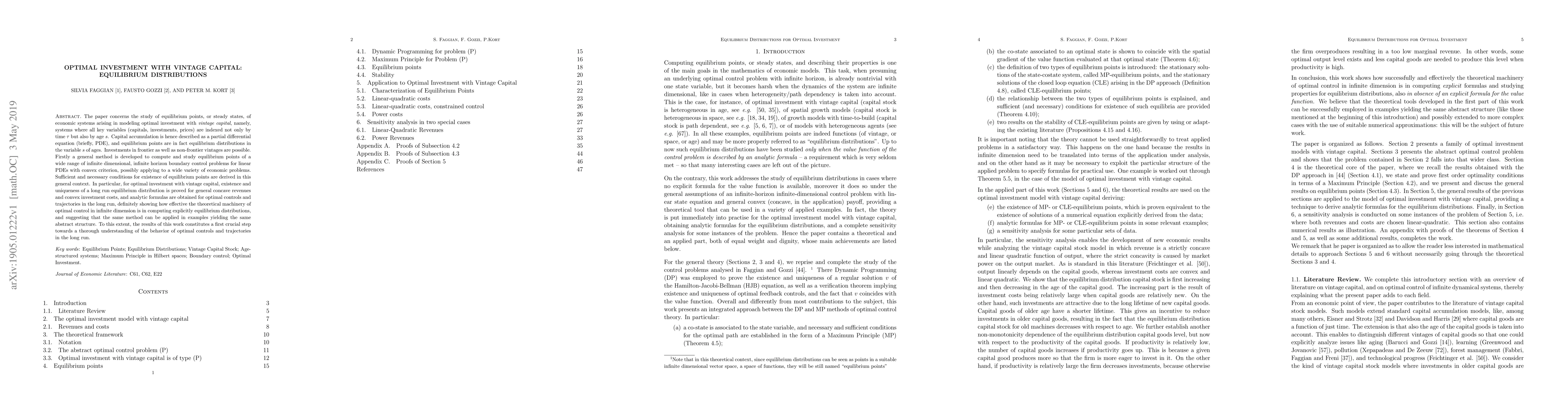 The paper concerns the study of equilibrium points, or steady states, of economic systems arising in modeling optimal investment with \textit{vintage capital}, namely, systems where all key variables (capitals, investments, prices) are indexed not only by time $\tau$ but also by age $s$. Capital accumulation is hence described as a partial differential equation (briefly, PDE), and equilibrium points are in fact equilibrium distributions in the variable $s$ of ages. Investments in frontier as well as non-frontier vintages are possible. Firstly a general method is developed to compute and study equilibrium points of a wide range of infinite dimensional, infinite horizon boundary control problems for linear PDEs with convex criterion, possibly applying to a wide variety of economic problems. Sufficient and necessary conditions for existence of equilibrium points are derived in this general context. In particular, for optimal investment with vintage capital, existence and uniqueness of a long run equilibrium distribution is proved for general concave revenues and convex investment costs, and analytic formulas are obtained for optimal controls and trajectories in the long run, definitely showing how effective the theoretical machinery of optimal control in infinite dimension is in computing explicitly equilibrium distributions, and suggesting that the same method can be applied in examples yielding the same abstract structure. To this extent, the results of this work constitutes a first crucial step towards a thorough understanding of the behavior of optimal controls and trajectories in the long run.