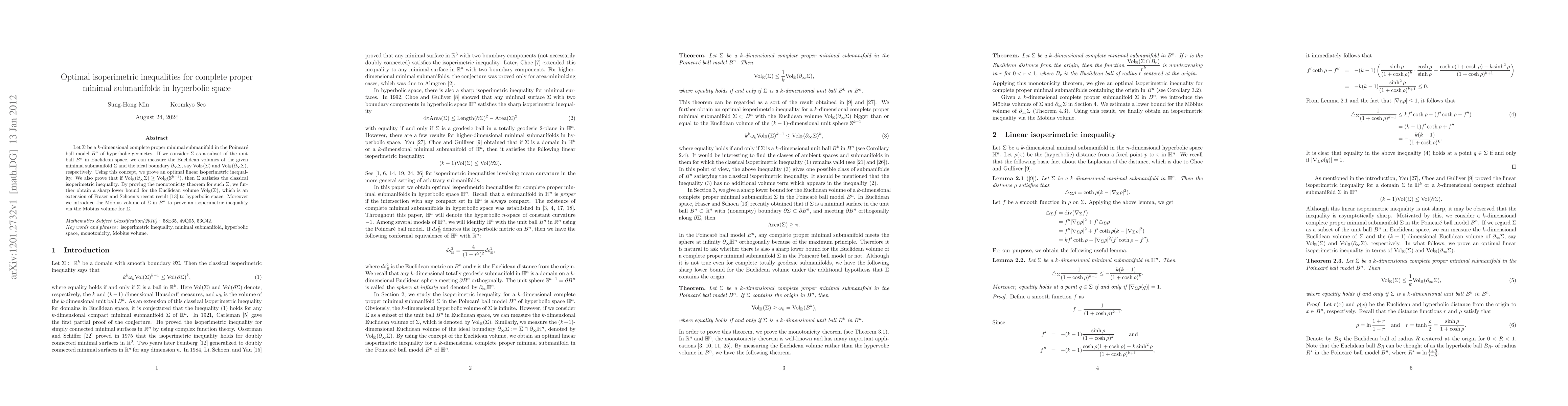 Let $\Sigma$ be a $k$-dimensional complete proper minimal submanifold in the Poincar\'{e} ball model $B^n$ of hyperbolic geometry. If we consider $\Sigma$ as a subset of the unit ball $B^n$ in Euclidean space, we can measure the Euclidean volumes of the given minimal submanifold $\Sigma$ and the ideal boundary $\partial_\infty \Sigma$, say $\rvol(\Sigma)$ and $\rvol(\partial_\infty \Sigma)$, respectively. Using this concept, we prove an optimal linear isoperimetric inequality. We also prove that if $\rvol(\partial_\infty \Sigma) \geq \rvol(\mathbb{S}^{k-1})$, then $\Sigma$ satisfies the classical isoperimetric inequality. By proving the monotonicity theorem for such $\Sigma$, we further obtain a sharp lower bound for the Euclidean volume $\rvol(\Sigma)$, which is an extension of Fraser and Schoen's recent result \cite{FS} to hyperbolic space. Moreover we introduce the M\"{o}bius volume of $\Sigma$ in $B^n$ to prove an isoperimetric inequality via the M\"{o}bius volume for $\Sigma$.